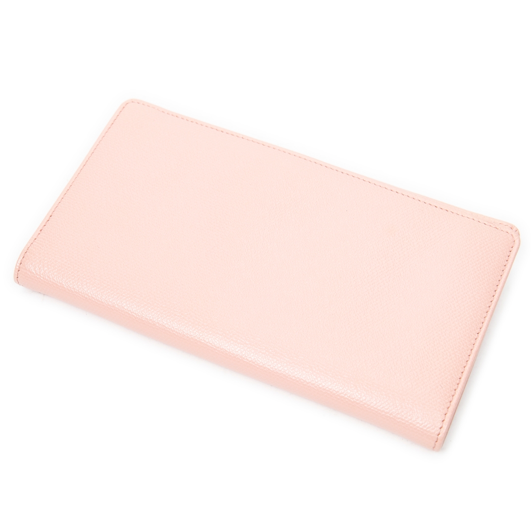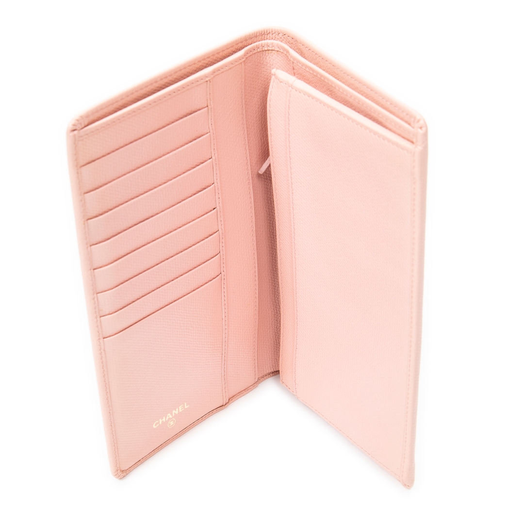 A vintage Chanel pink calfskin leather CC Button Long Bifold Wallet with a certificate of authenticity, Approximately 10cm height, 18cm width.
