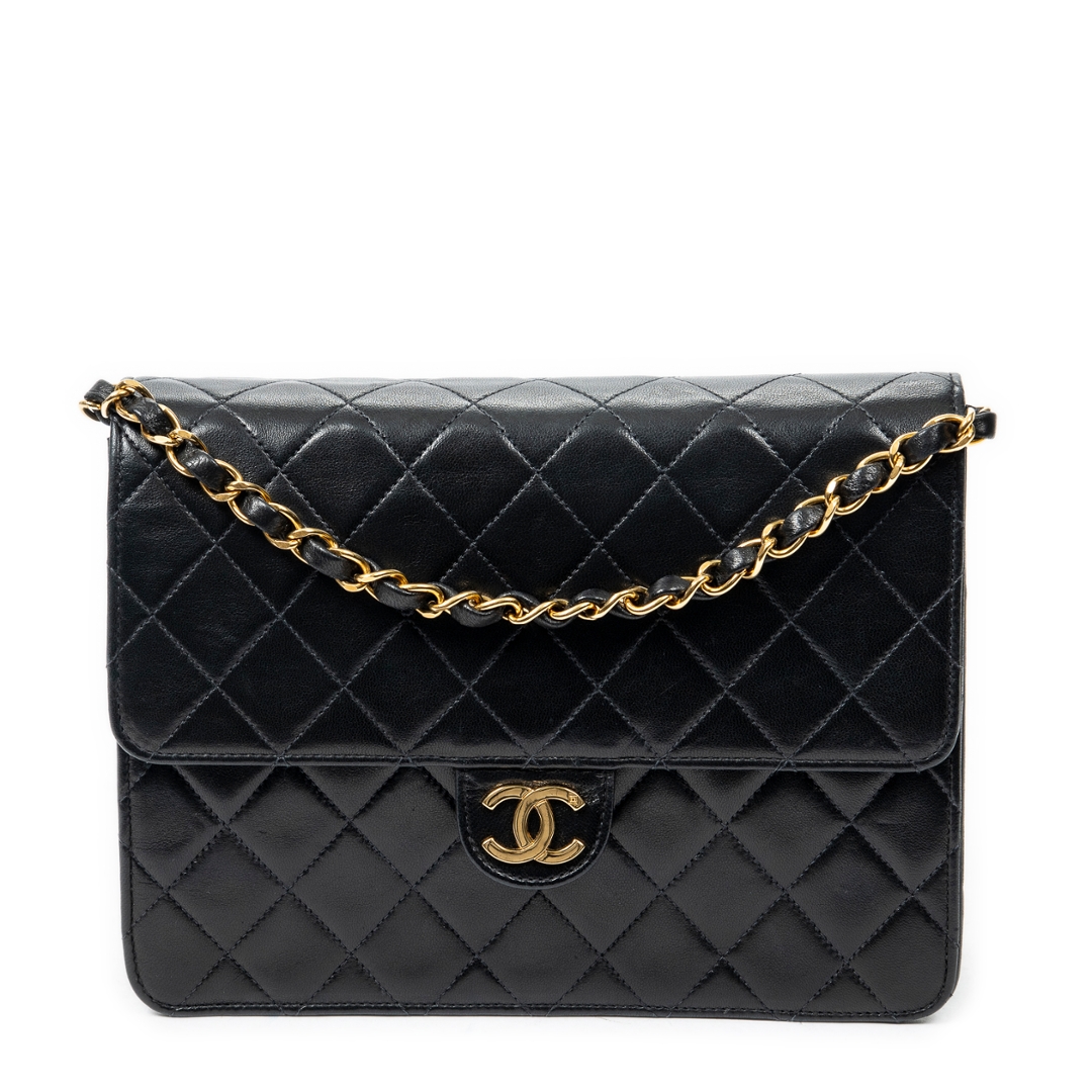 A vintage Chanel black quilted lambskin leather CC Push Lock Straight Single Flap bag, embodying the house’s most iconic design language. Crafted from supple lambskin, the classic diamond quilting creates a soft yet structured silhouette, complemented by gold-tone hardware and the signature CC push lock closure. The leather-threaded chain strap adds a timeless finish synonymous with Chanel’s heritage.