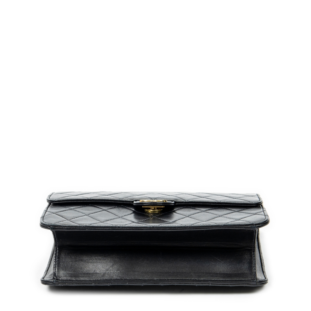 A vintage Chanel black quilted lambskin leather CC Push Lock Straight Single Flap bag with a certificate of authenticity, Approximately 17cm height, 22cm width.