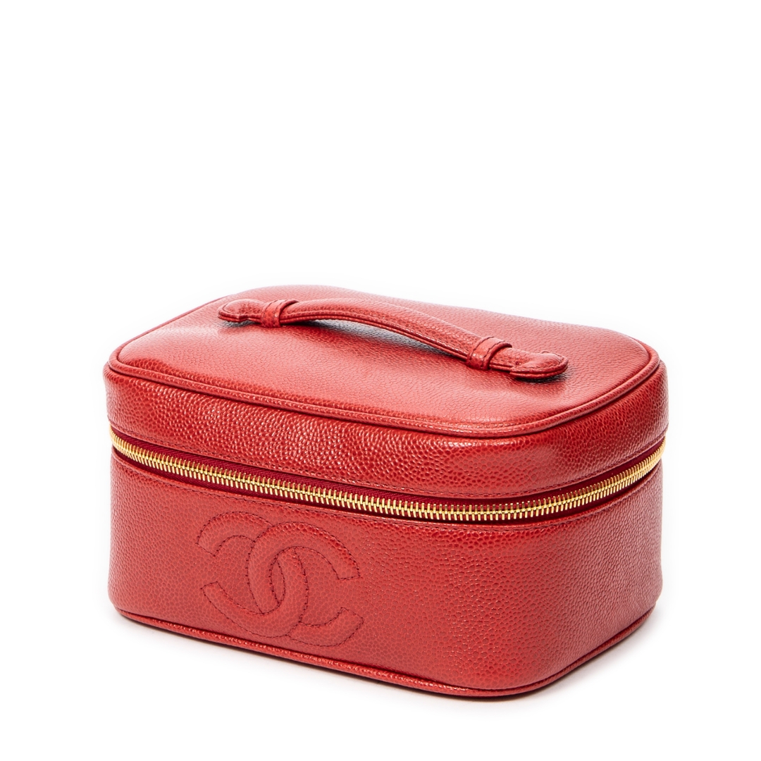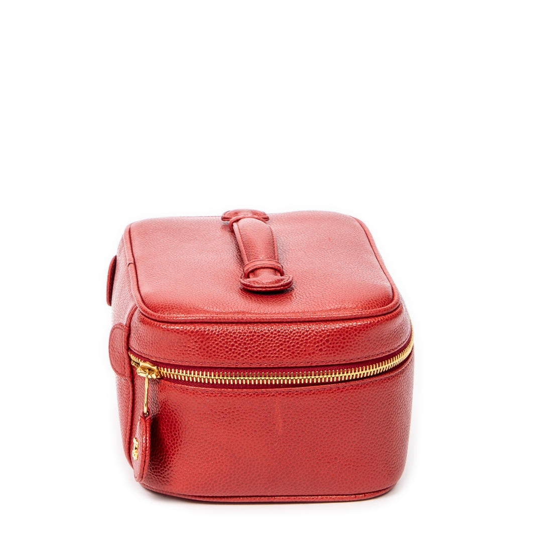 The compact vanity-style form is both practical and elegant, featuring a secure zip-around closure with gold-tone hardware that contrasts beautifully against the red leather. A top handle enhances its classic appeal while ensuring ease of carry, making it a versatile piece suited to both day and evening use without compromising on sophistication.