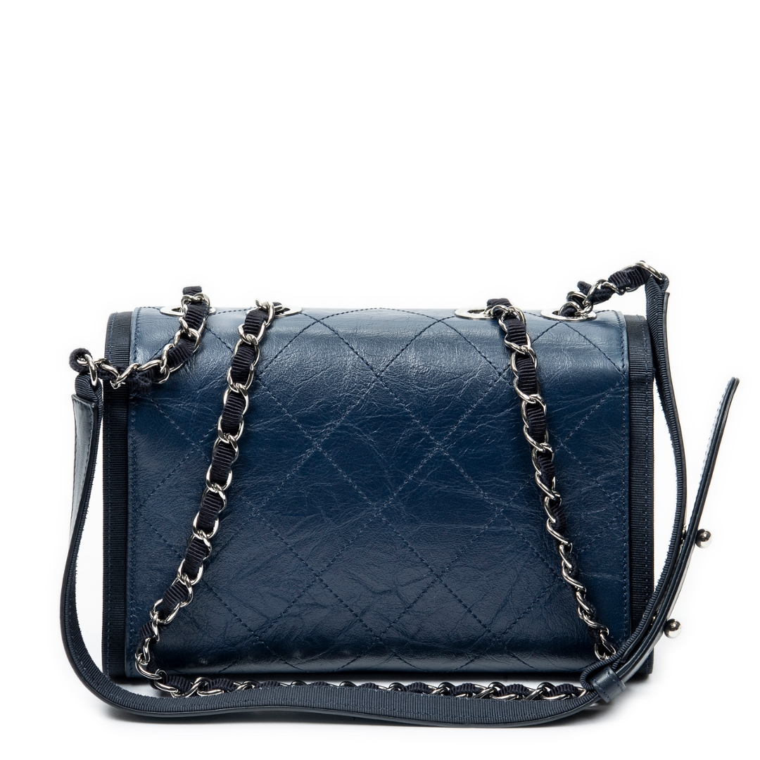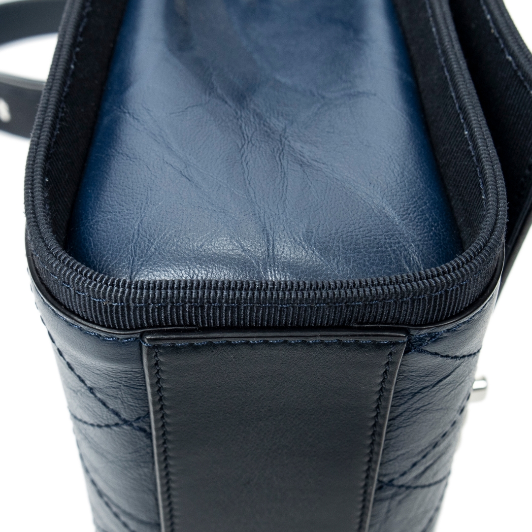 A vintage Chanel navy quilted crumpled calfskin leather CC Single Flap bag, offering a contemporary twist on the house’s iconic design codes. Crafted from softly textured crumpled calfskin, the diamond quilting is enhanced by a relaxed, slightly distressed finish that adds depth and character. The silver-tone CC turn-lock closure and coordinating hardware provide a modern contrast against the rich navy tone.