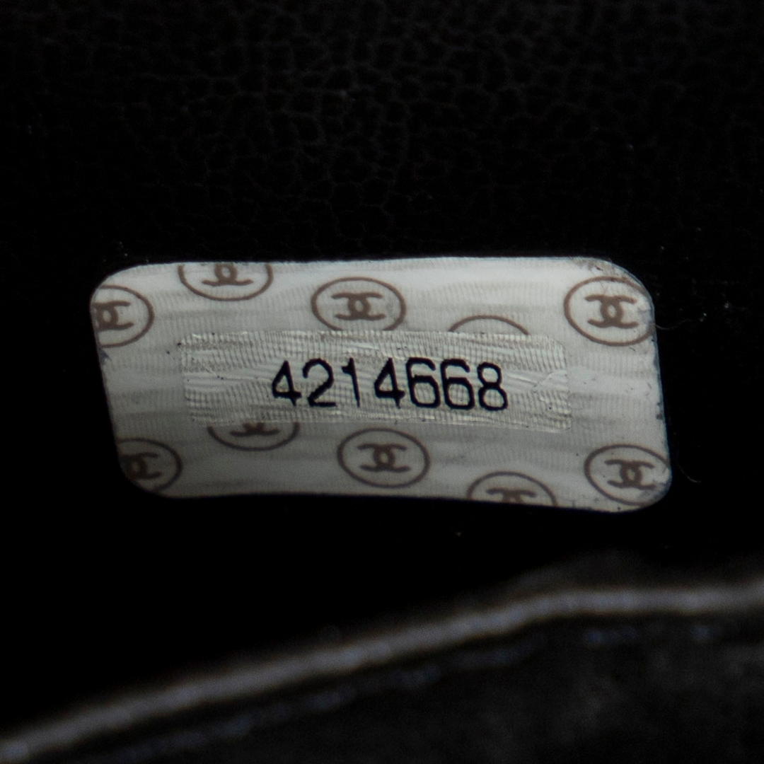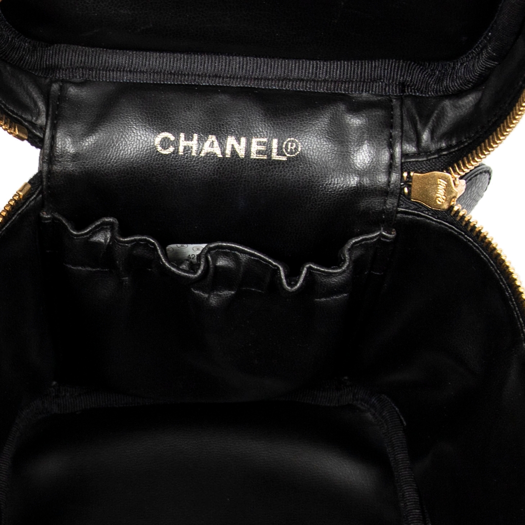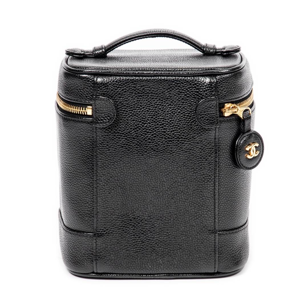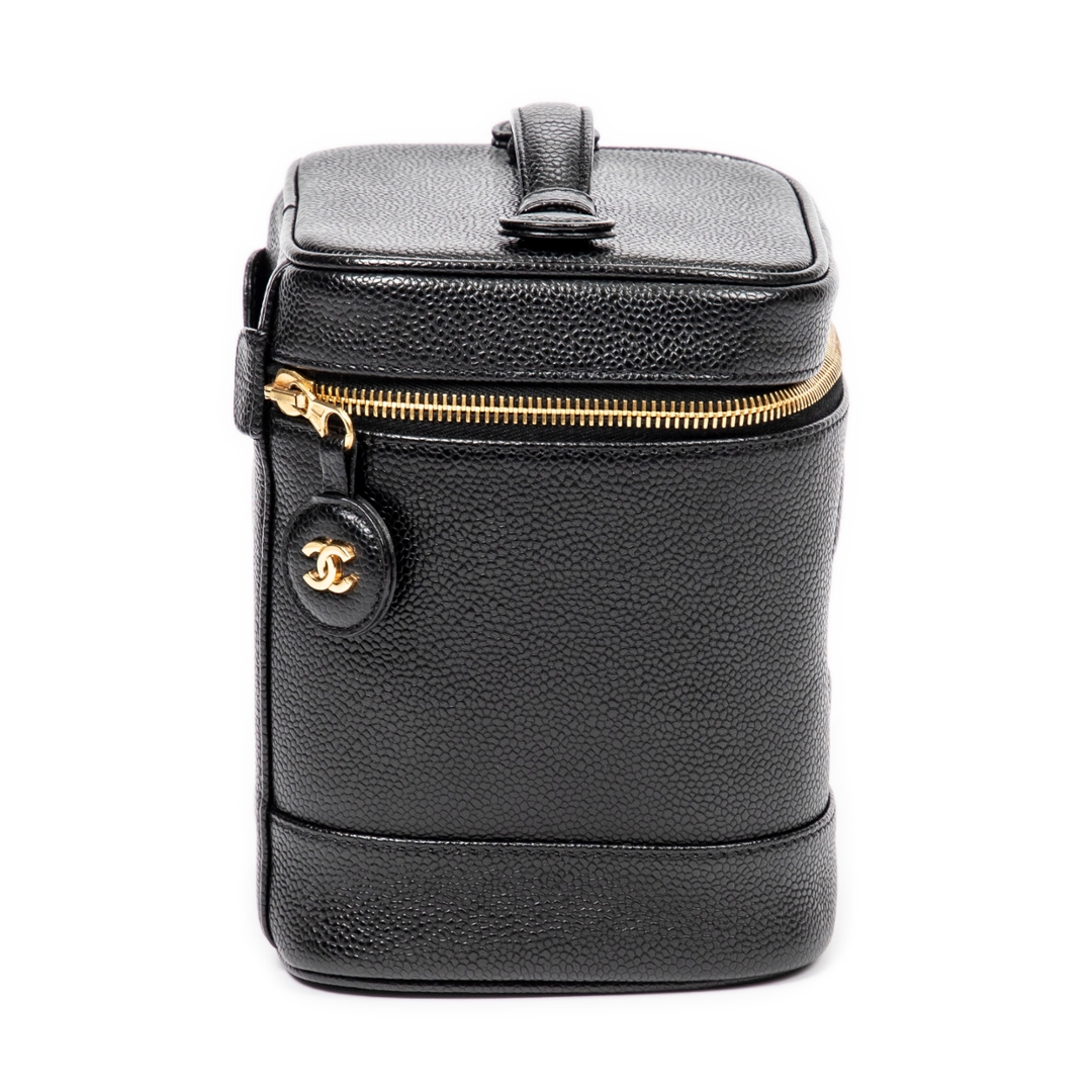 A vintage Chanel black calf leather CC Tall Vanity Case bag with a certificate of authenticity, Approximately 17cm height, 15cm width.