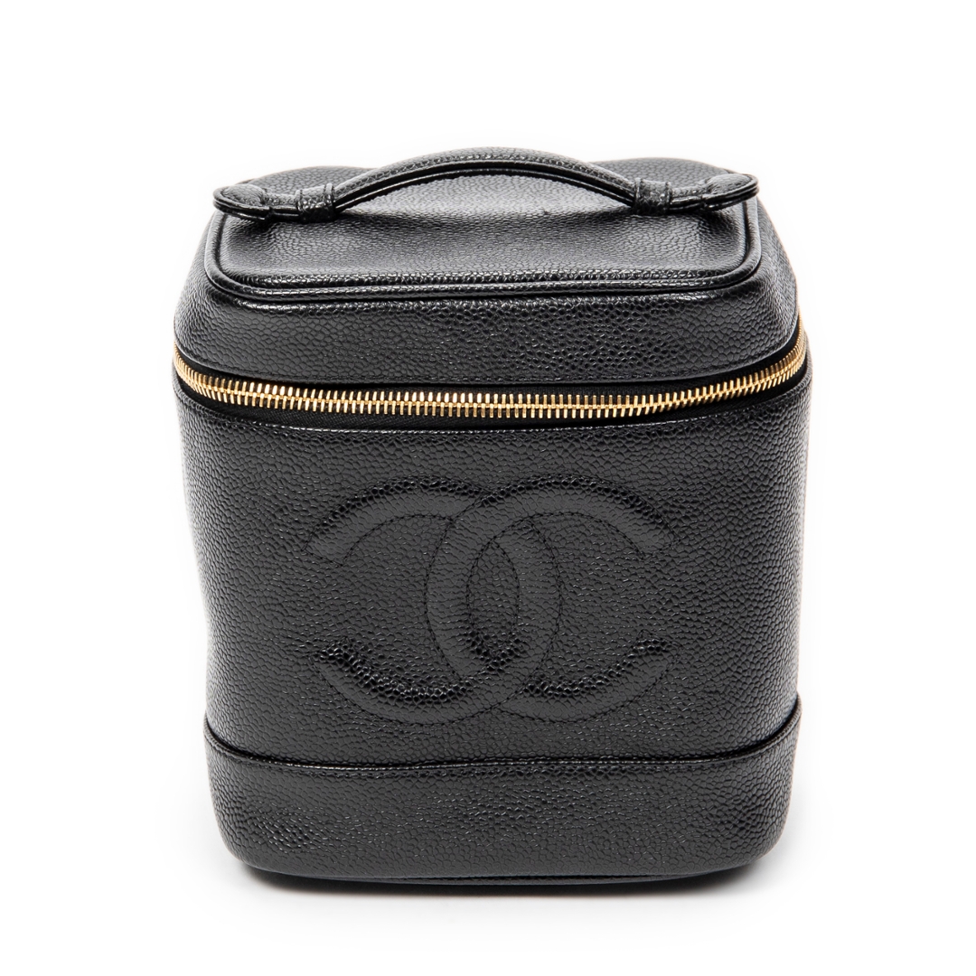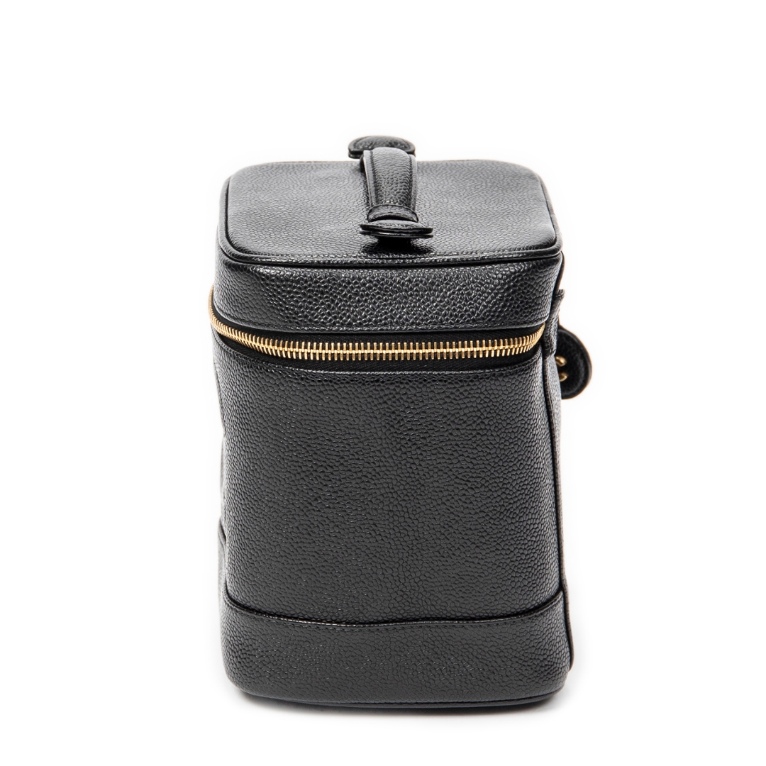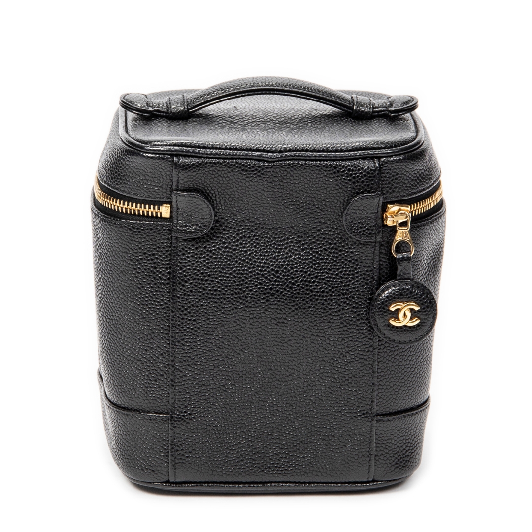 A vintage Chanel black calf leather CC Tall Vanity Case bag with a certificate of authenticity, Approximately 12cm height, 15cm width.