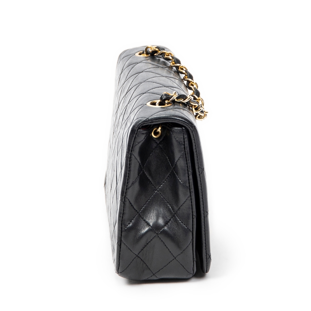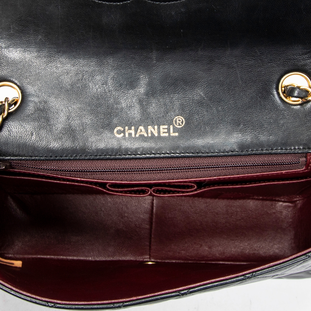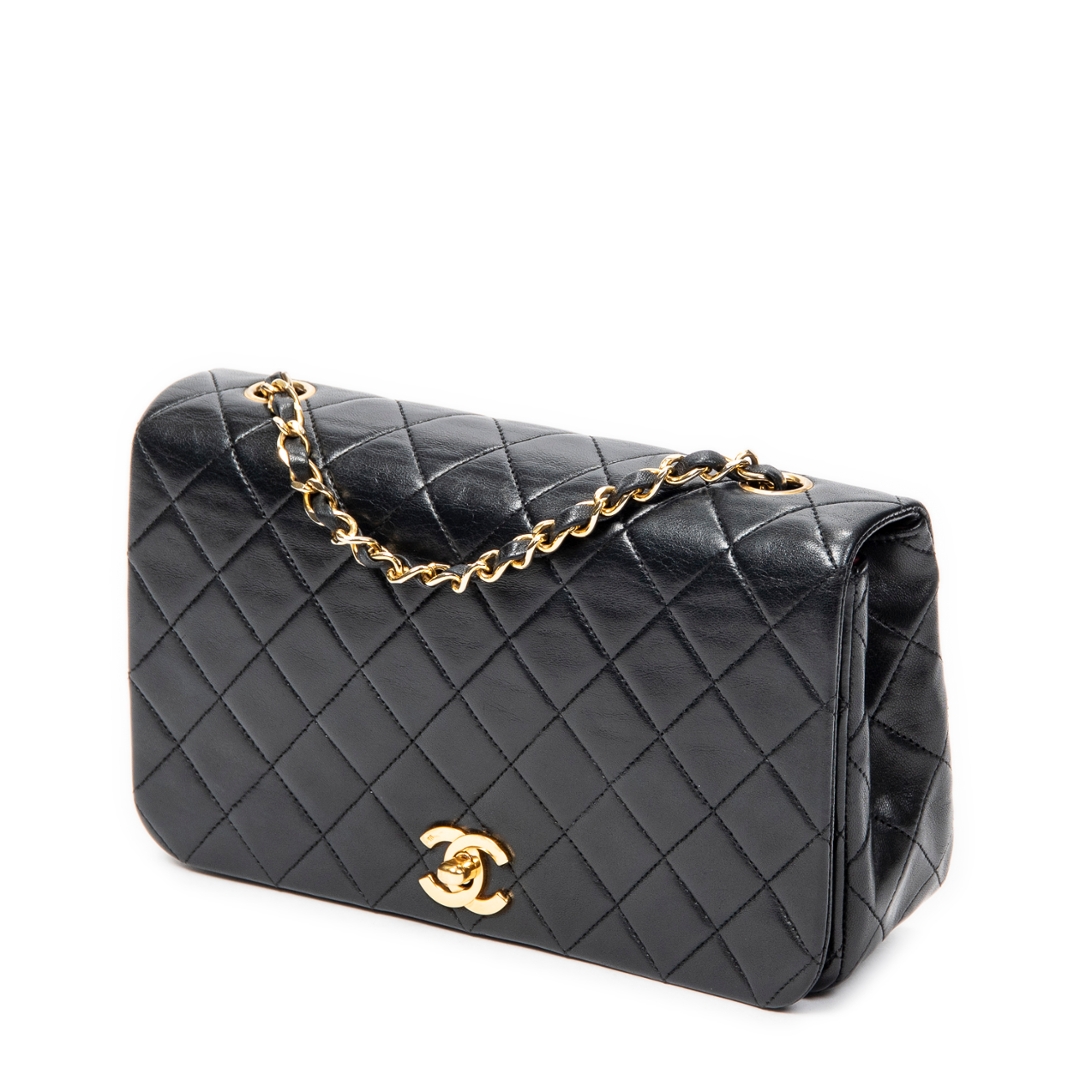 A vintage Chanel black quilted lambskin leather CC Turn Lock Mademoiselle Full Flap bag, representing one of the most iconic and enduring designs from the house. Crafted from supple lambskin, the classic diamond quilting enhances both texture and structure, while the gold-tone CC turn-lock closure adds a refined focal point. The leather-interwoven chain strap completes the signature Chanel aesthetic.