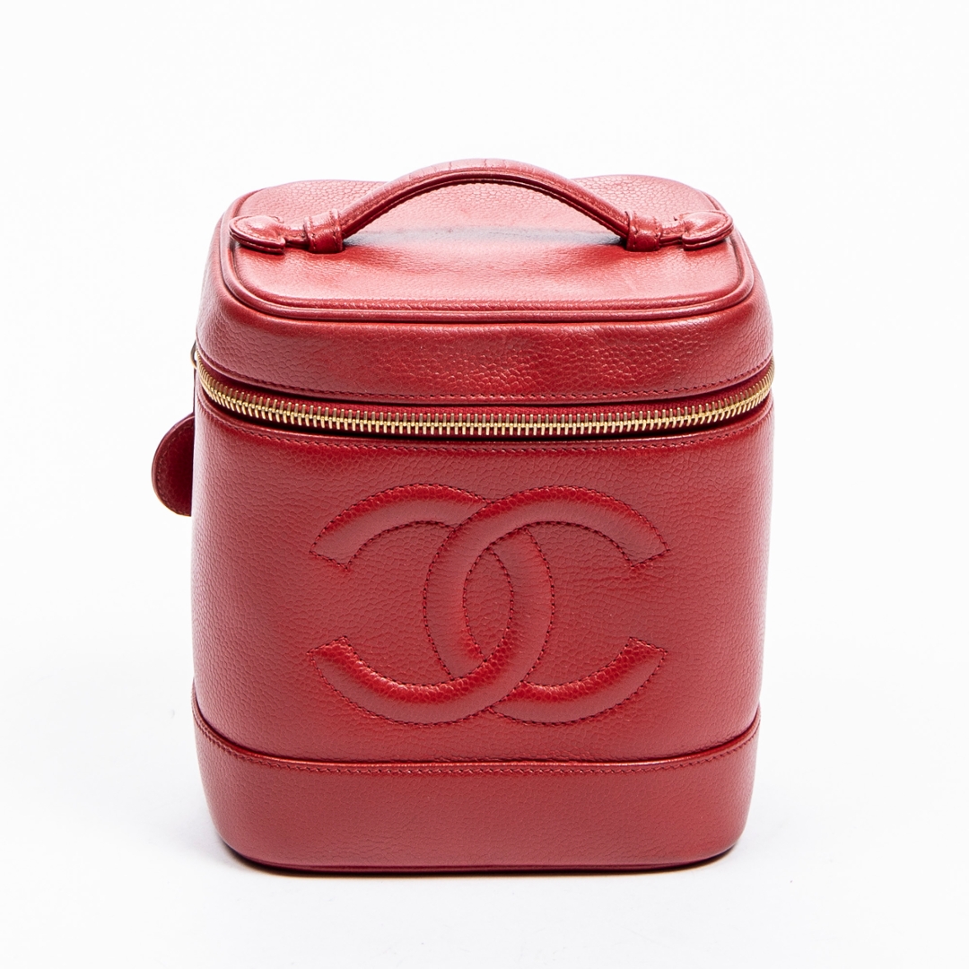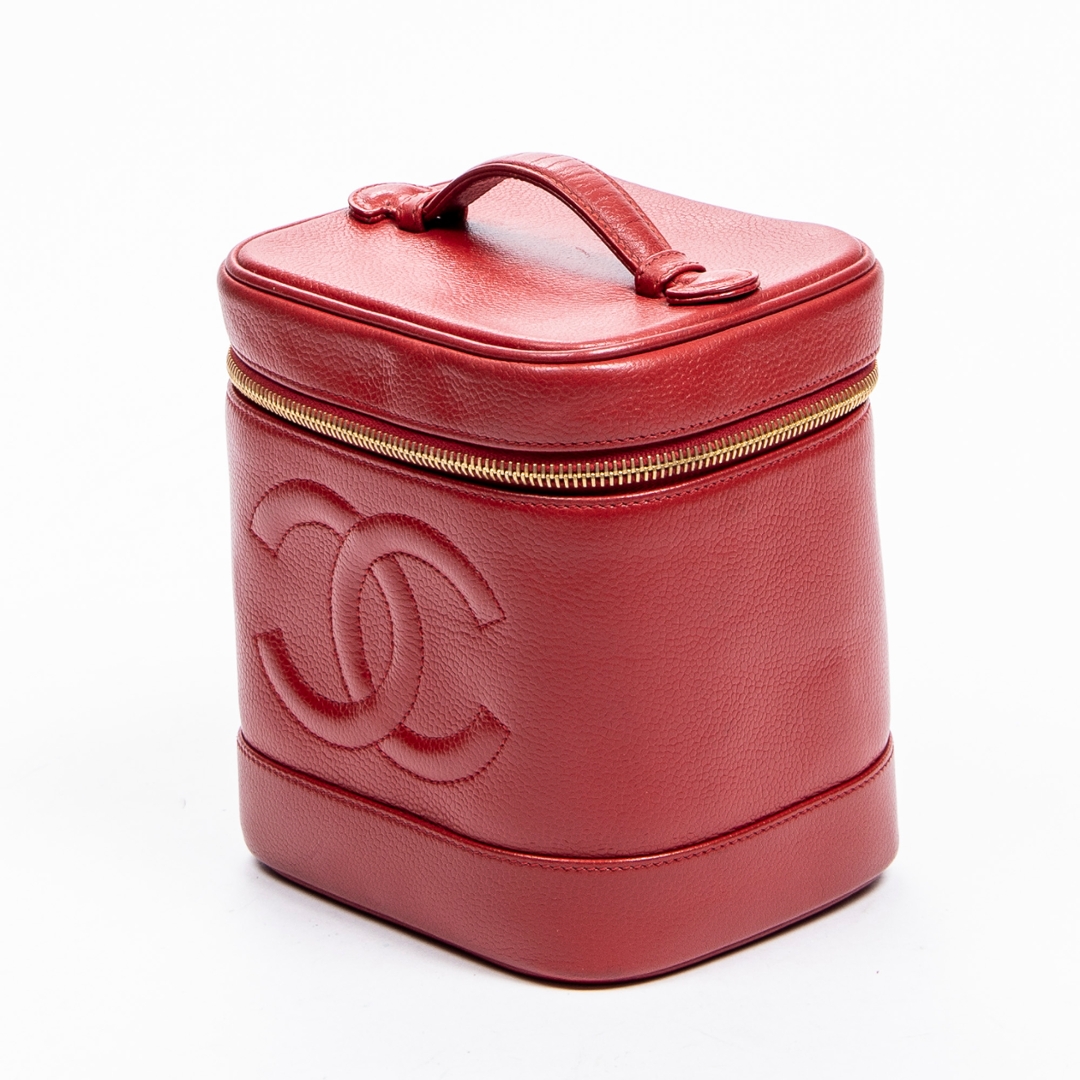 A vintage Chanel red calf leather CC Vanity Case bag with a certificate of authenticity, Approximately 16cm height, 15cm width.