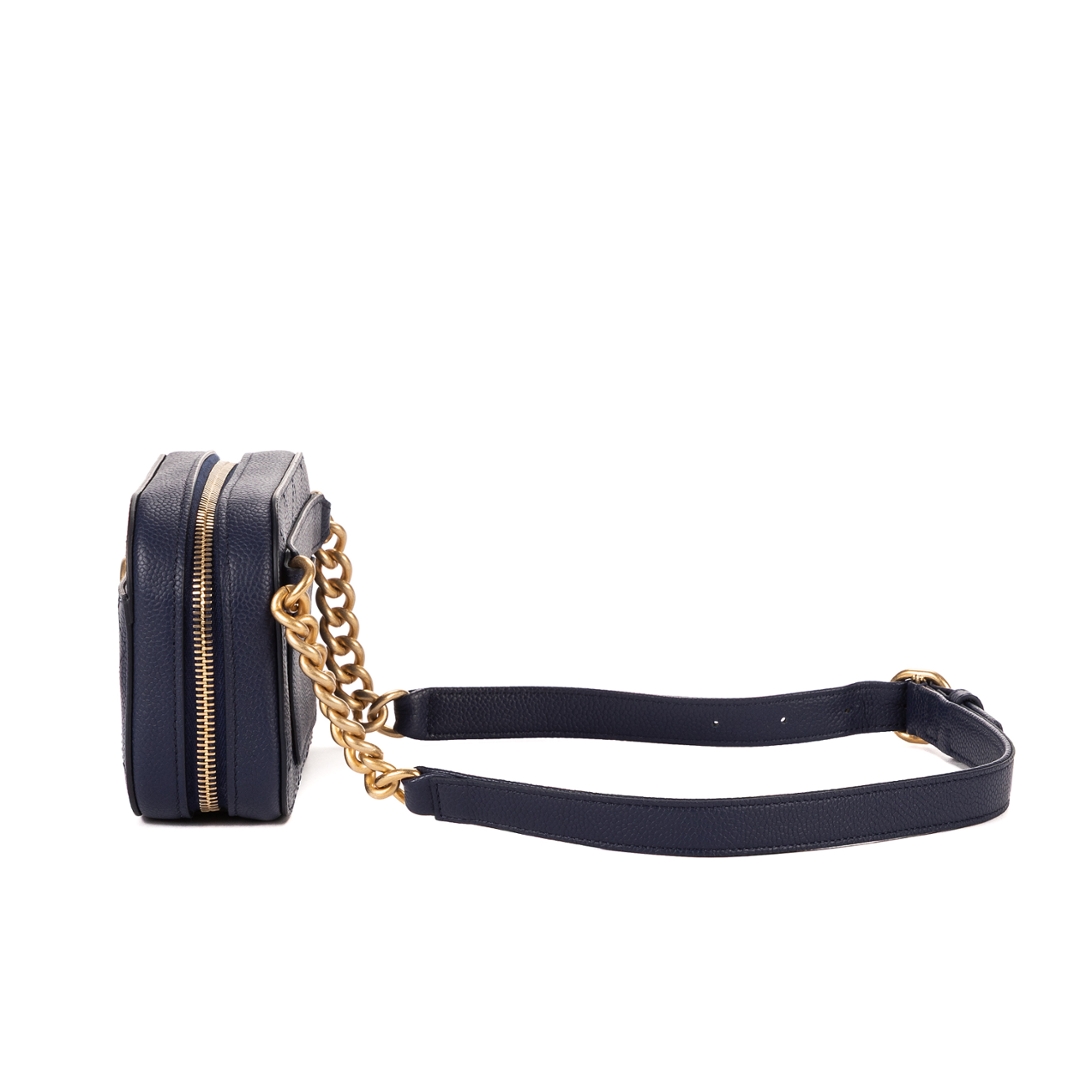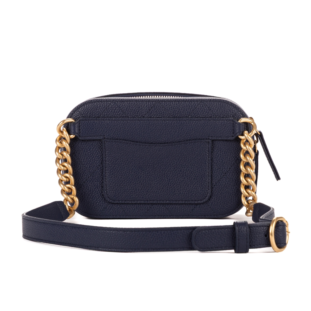 A vintage Chanel Chic Affinity Belt Bag, presented in a refined dark navy caviar leather that embodies the house’s timeless elegance. The softly structured silhouette is enhanced by classic diamond quilting, while the gold-tone CC logo to the front delivers an instantly recognisable signature. Crafted with Chanel’s renowned attention to detail, this piece offers both durability and enduring style.
