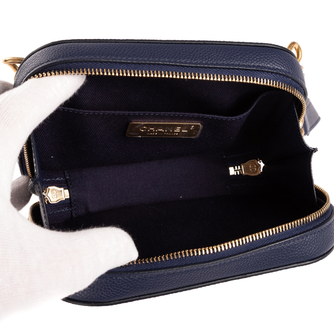 The compact design is complemented by a smooth zip-around closure, finished with gold-tone hardware that pairs beautifully with the rich leather tone. A leather belt strap with chain detailing adds a contemporary edge while maintaining the classic Chanel aesthetic, making it a versatile accessory suited to both casual styling and elevated looks.