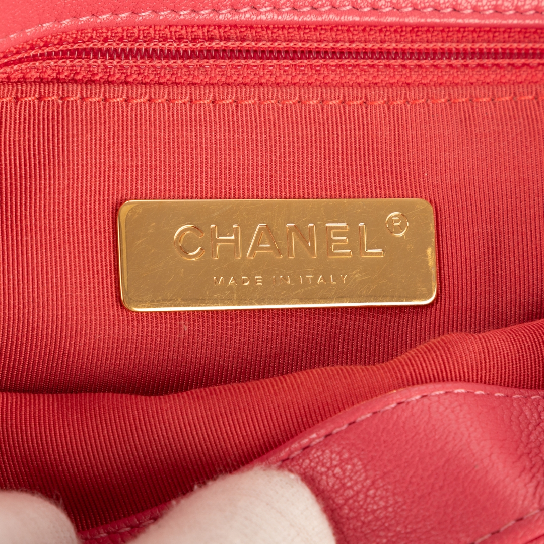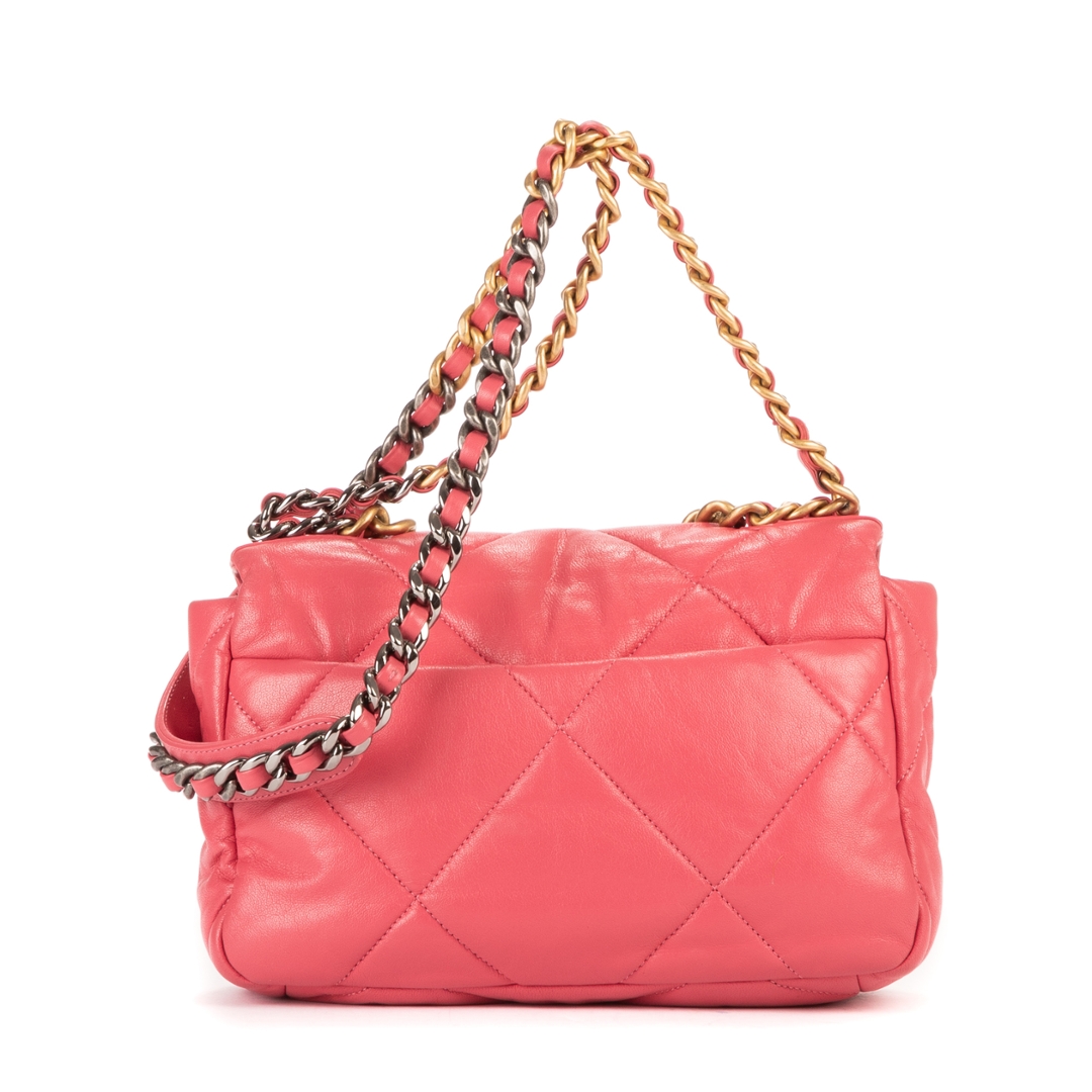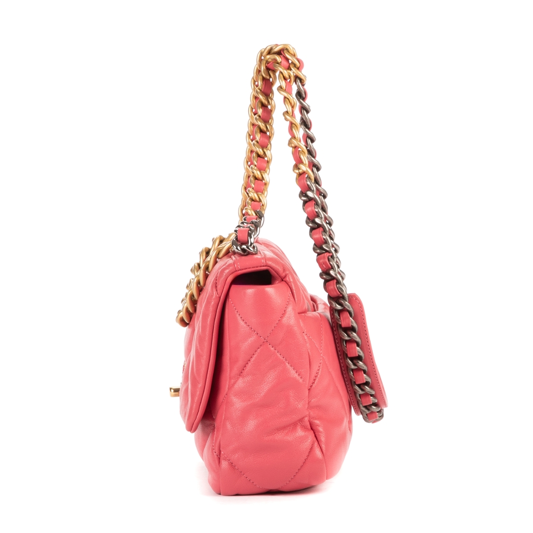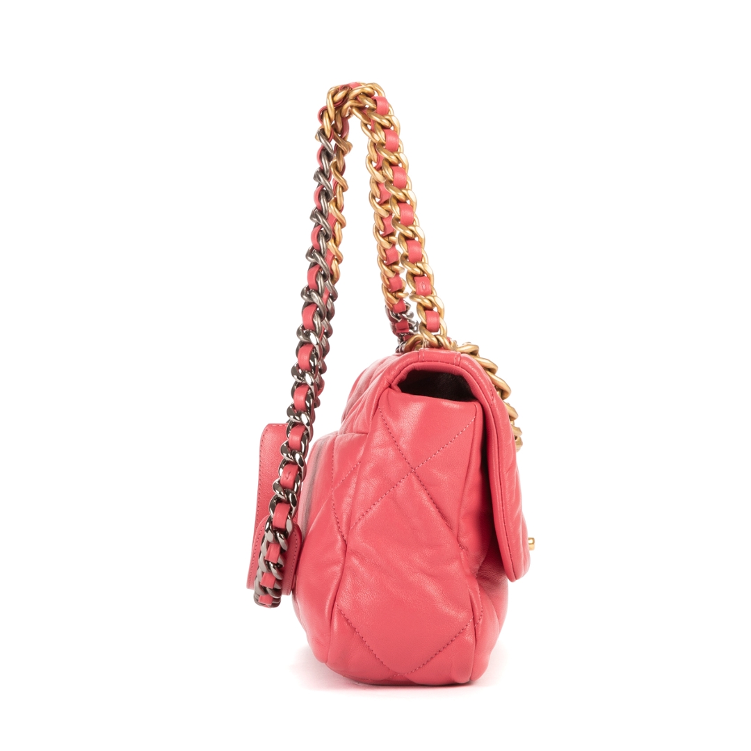 A vintage pink calf leather Chanel Classic 19 Flap bag with a certificate of authenticity, Approximately 17cm height, 25cm width.