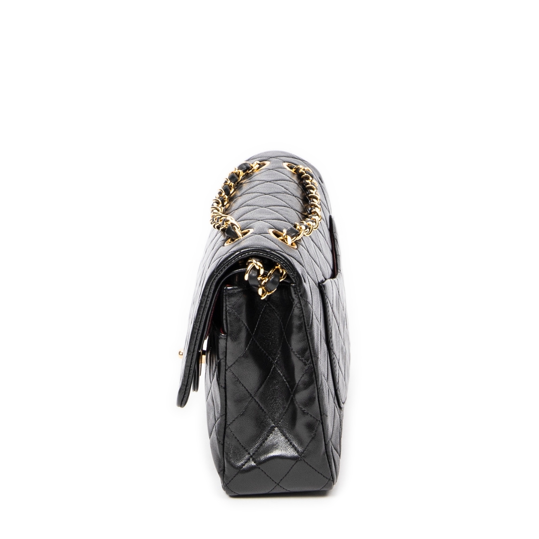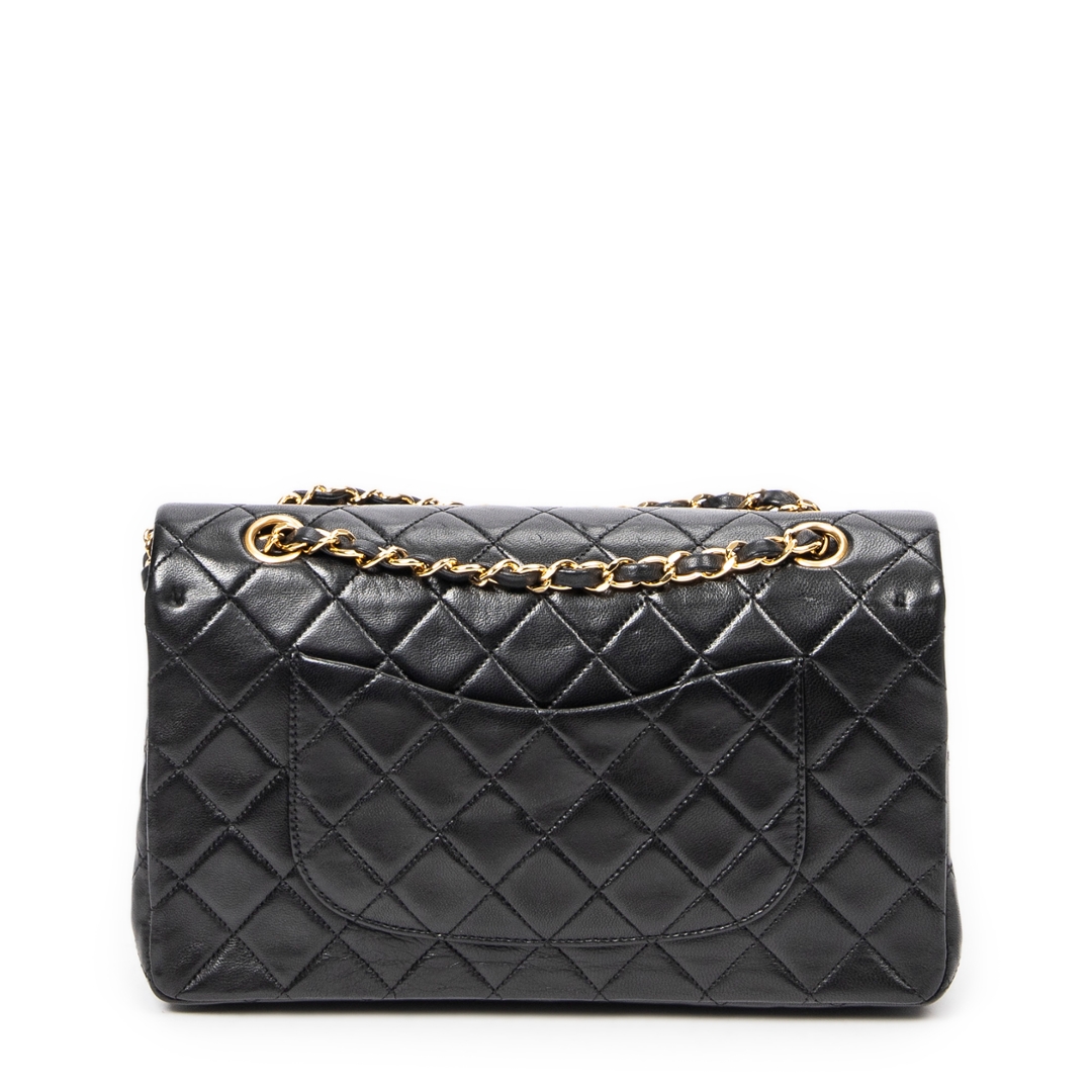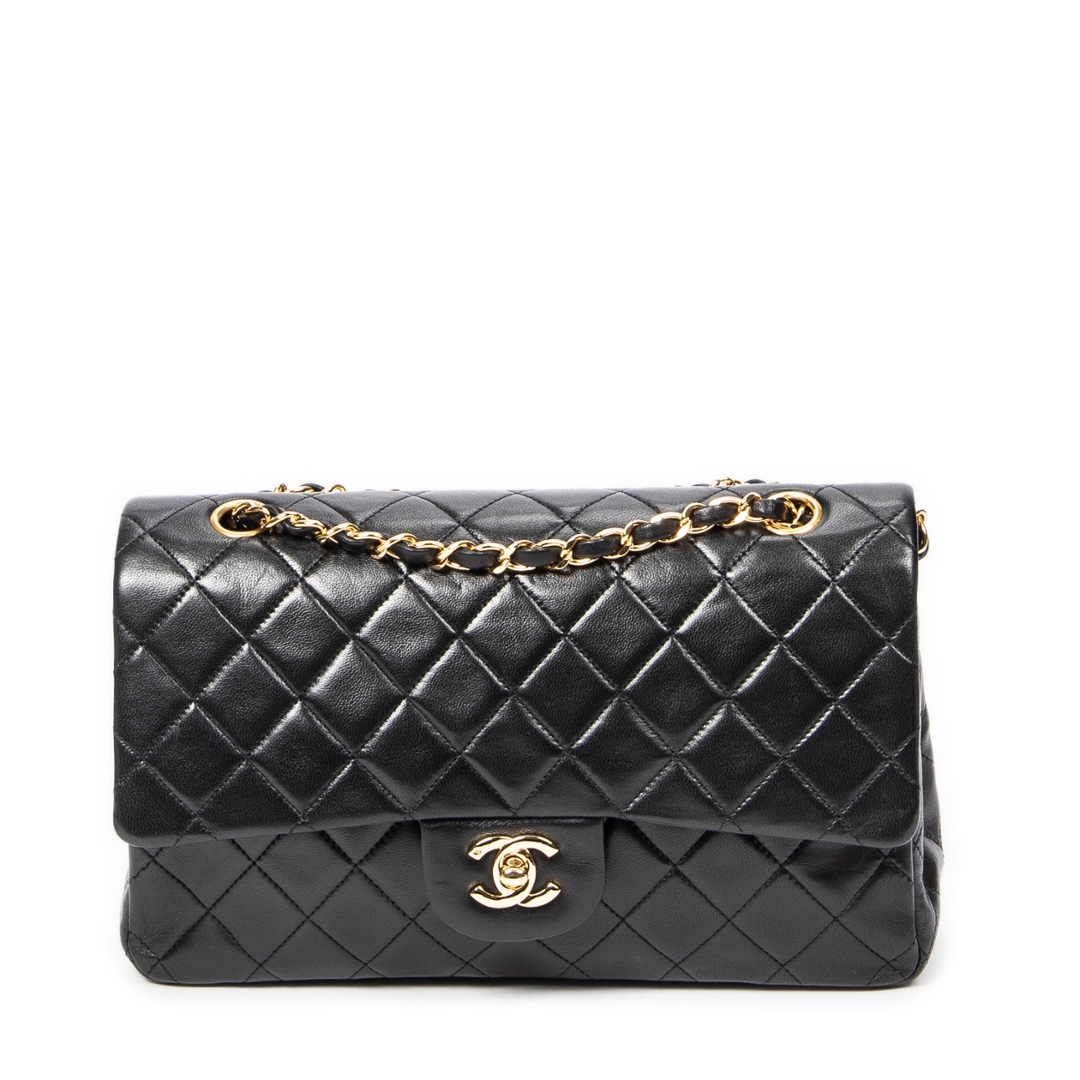 A vintage Chanel black quilted lambskin leather Classic Double Flap bag, representing one of the most iconic and enduring designs in luxury fashion. Crafted from supple lambskin, the signature diamond quilting enhances both texture and structure, while the gold-tone CC turn-lock closure and leather-interwoven chain strap deliver the unmistakable Chanel aesthetic.