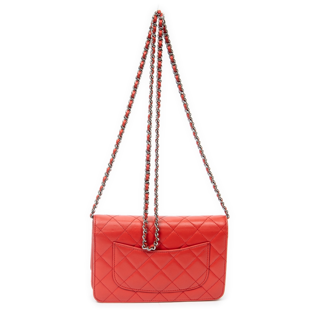 A vintage Chanel red calf leather Classic Wallet On Chain bag with a certificate of authenticity, Approximately 12cm height, 19cm width.