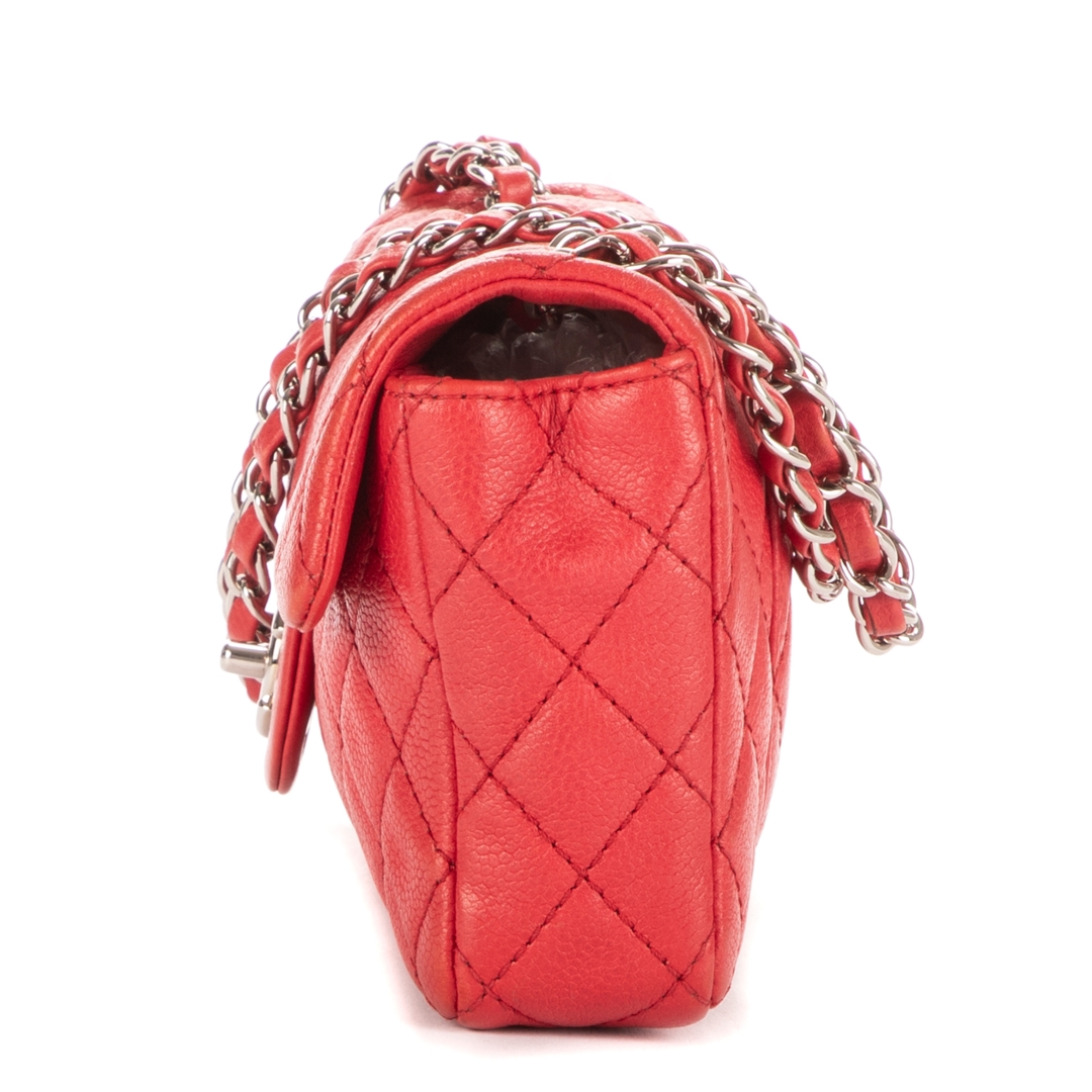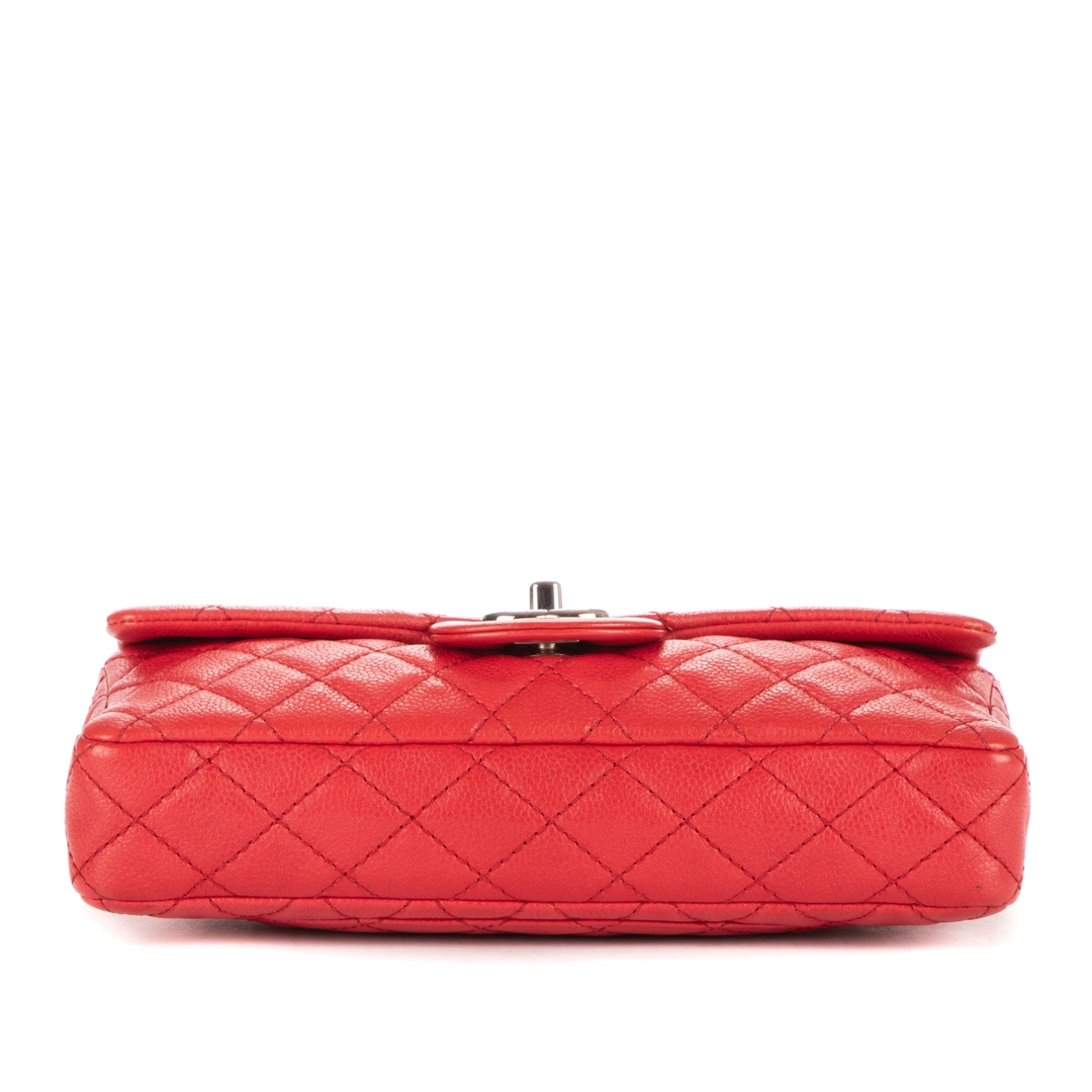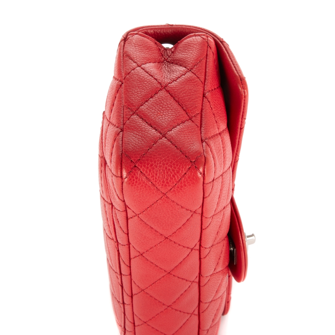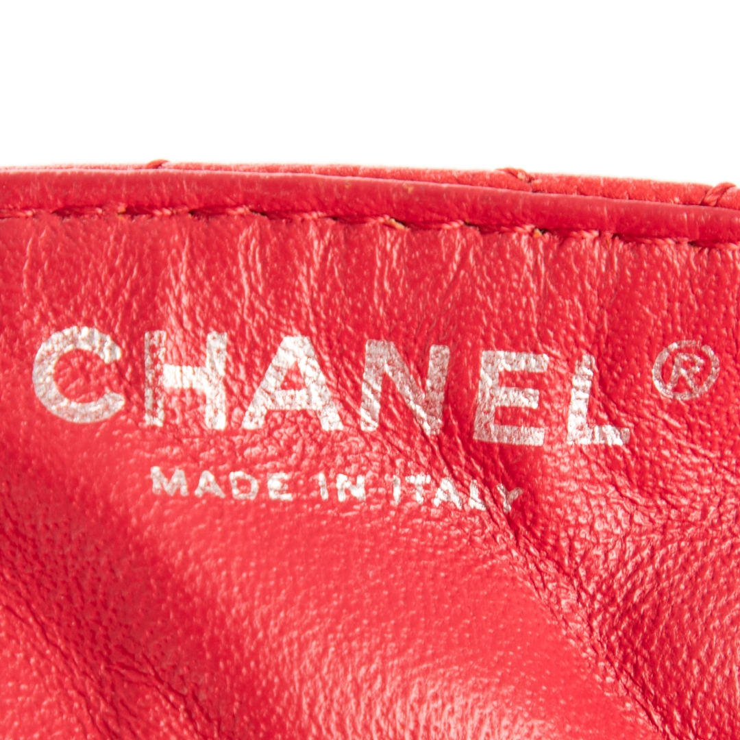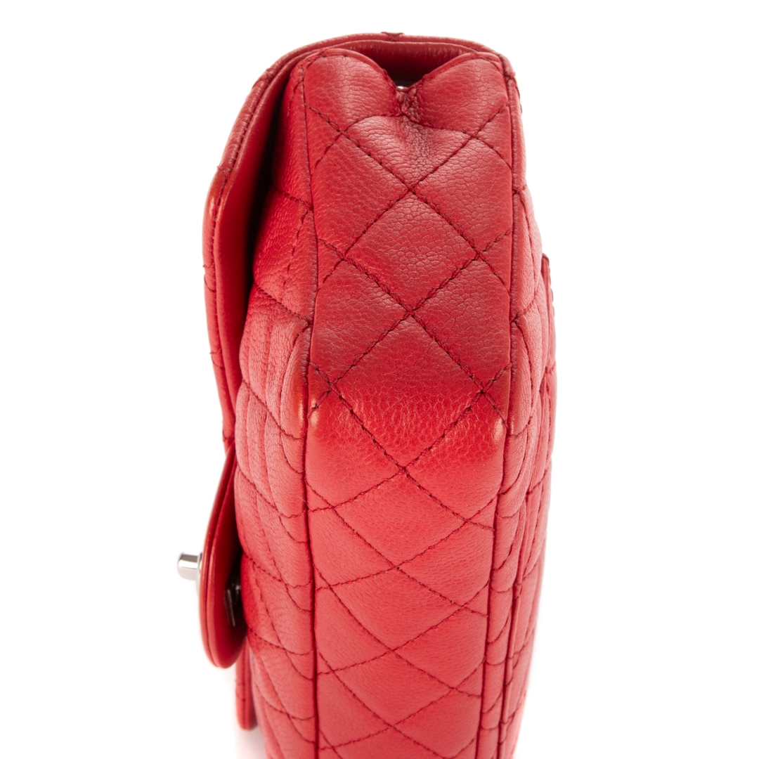A vintage Chanel red calf leather East-West Single Flap bag with a certificate of authenticity, Approximately 11cm height, 25cm width.