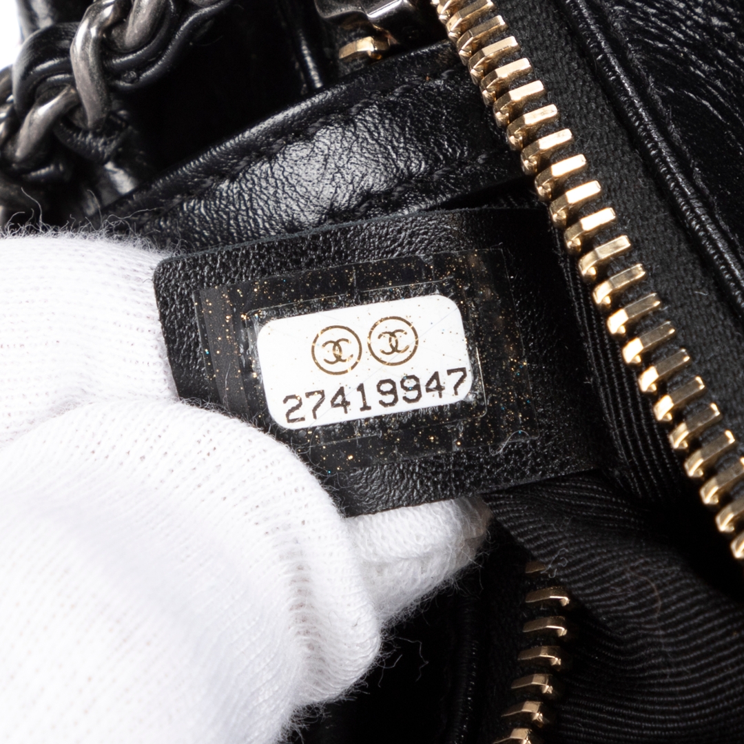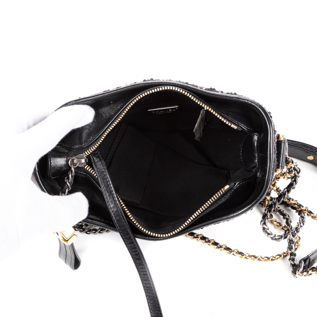 A vintage Chanel black calfskin leather & sequin canvas Gabrielle Sequins bag with a certificate of authenticity, Approximately 15cm height, 19cm width.