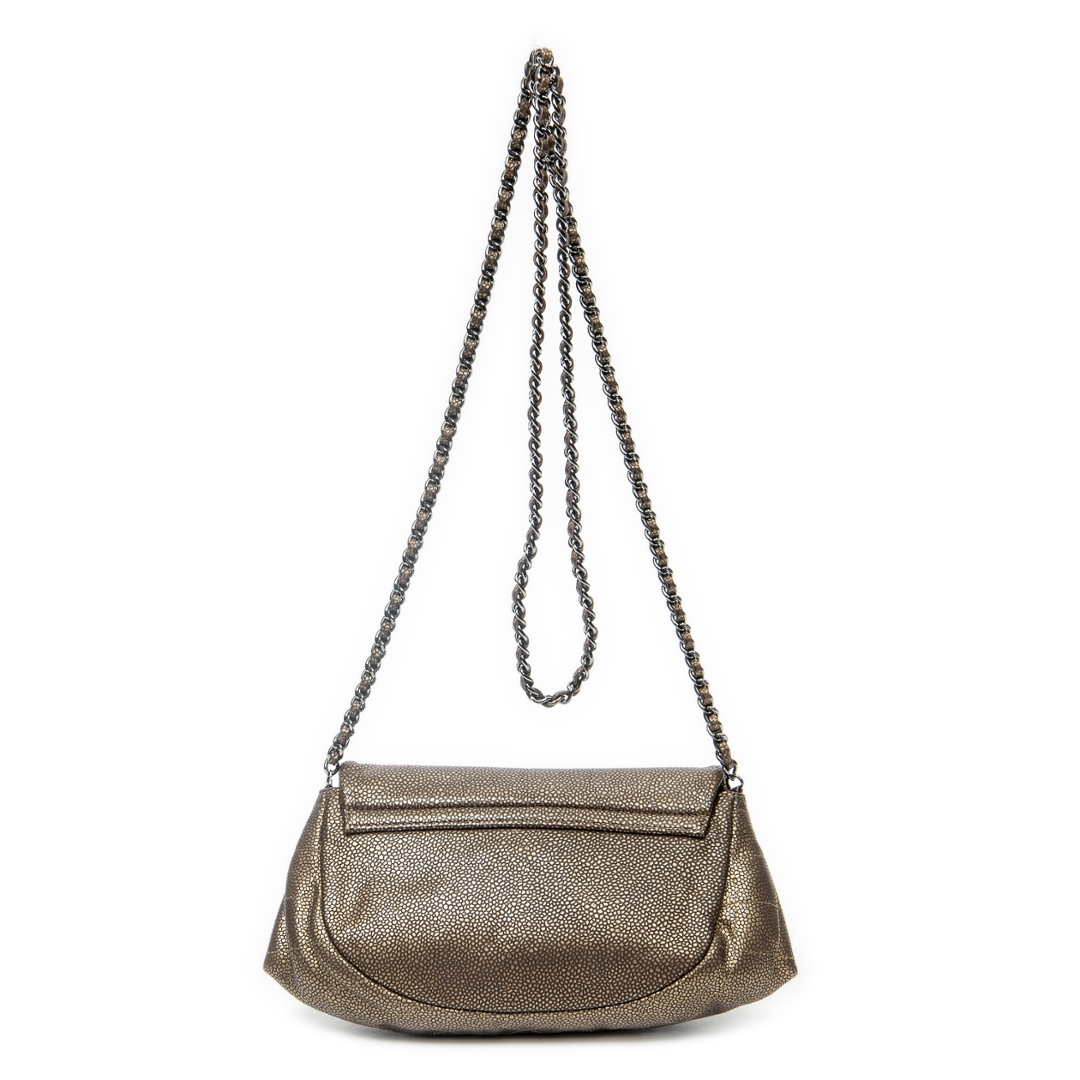 A vintage Chanel bronze calf leather Half Moon Wallet on Chain bag, offering a distinctive and elegant take on the house’s classic silhouettes. Crafted from finely grained calf leather, the softly curved half moon shape is enhanced by a rich metallic bronze finish, while the embossed CC logo to the front provides a subtle yet instantly recognisable Chanel signature.