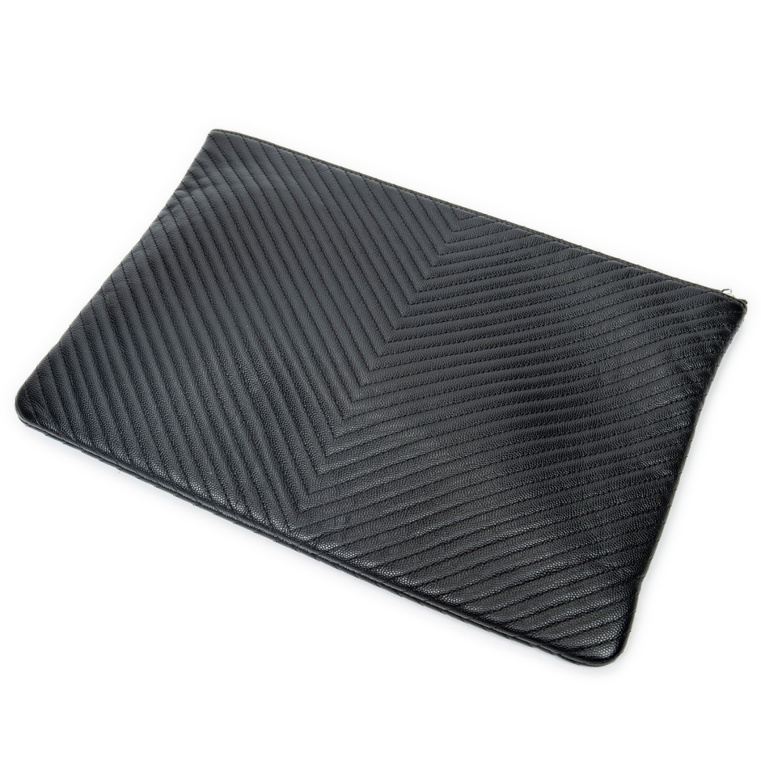 A vintage Chanel black chevron calf leather Large Chevron O-Case Zip bag, offering a refined and contemporary take on a classic Chanel accessory. Crafted from durable calf leather, the distinctive chevron quilting creates a dynamic textured finish, while the subtle CC logo detail adds a discreet yet instantly recognisable signature.