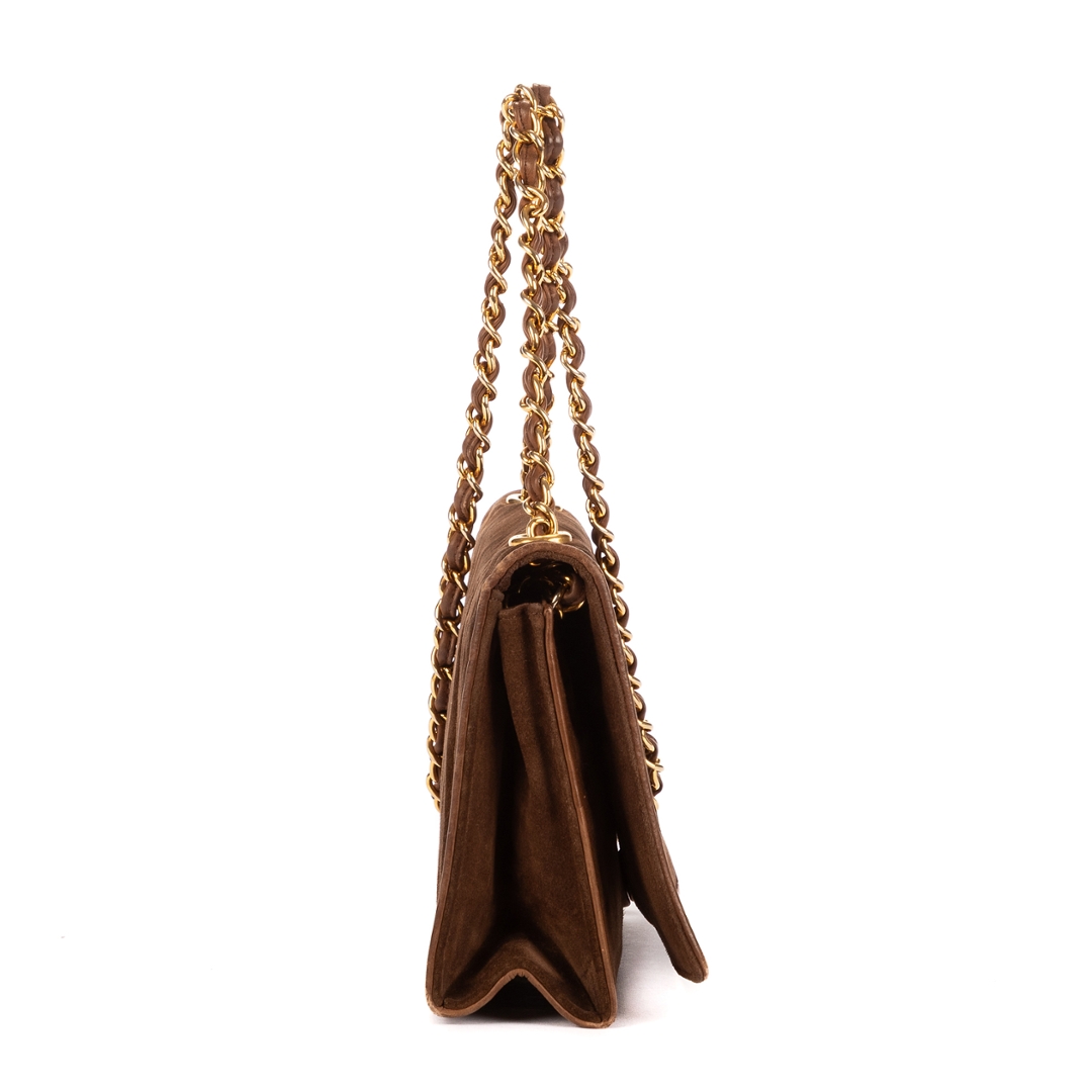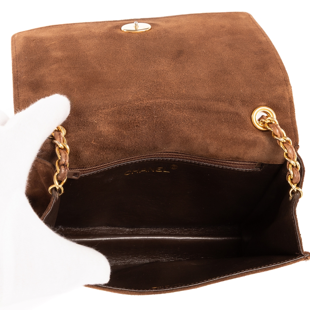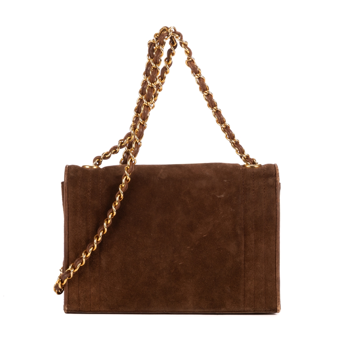 A vintage Chanel brown suede calf leather Logo Chain Flap bag with a certificate of authenticity, Approximately 14cm height, 20cm width.