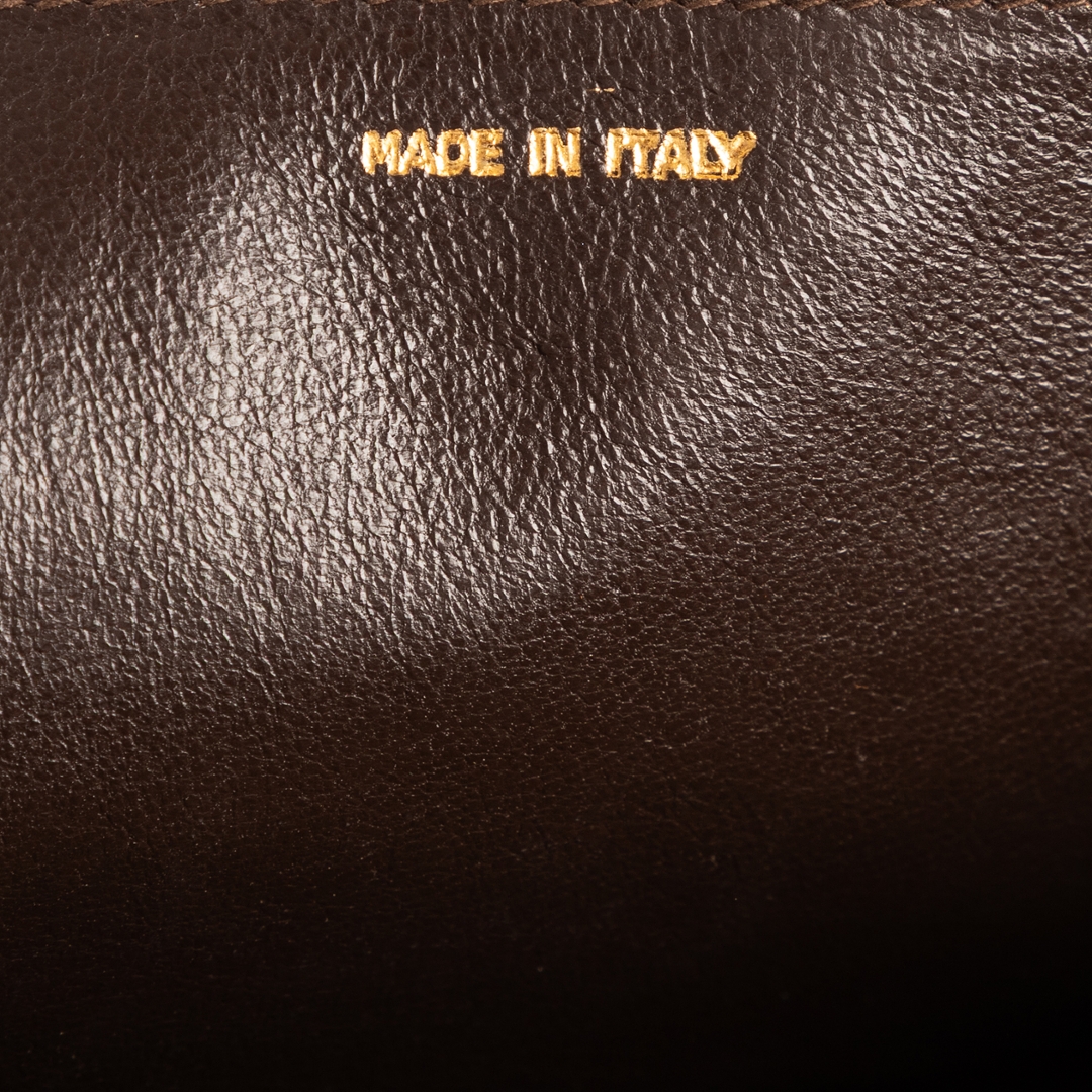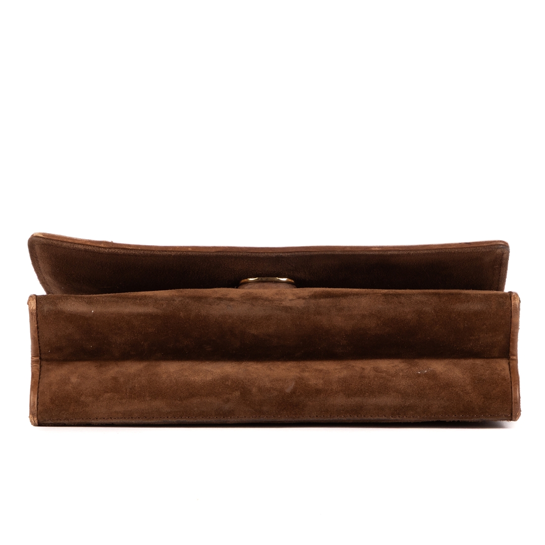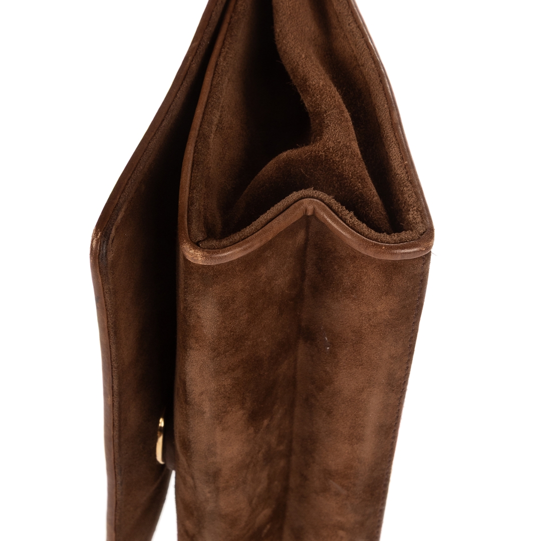 A vintage Chanel brown suede calf leather Logo Chain Flap bag with a certificate of authenticity, Approximately 14cm height, 20cm width.