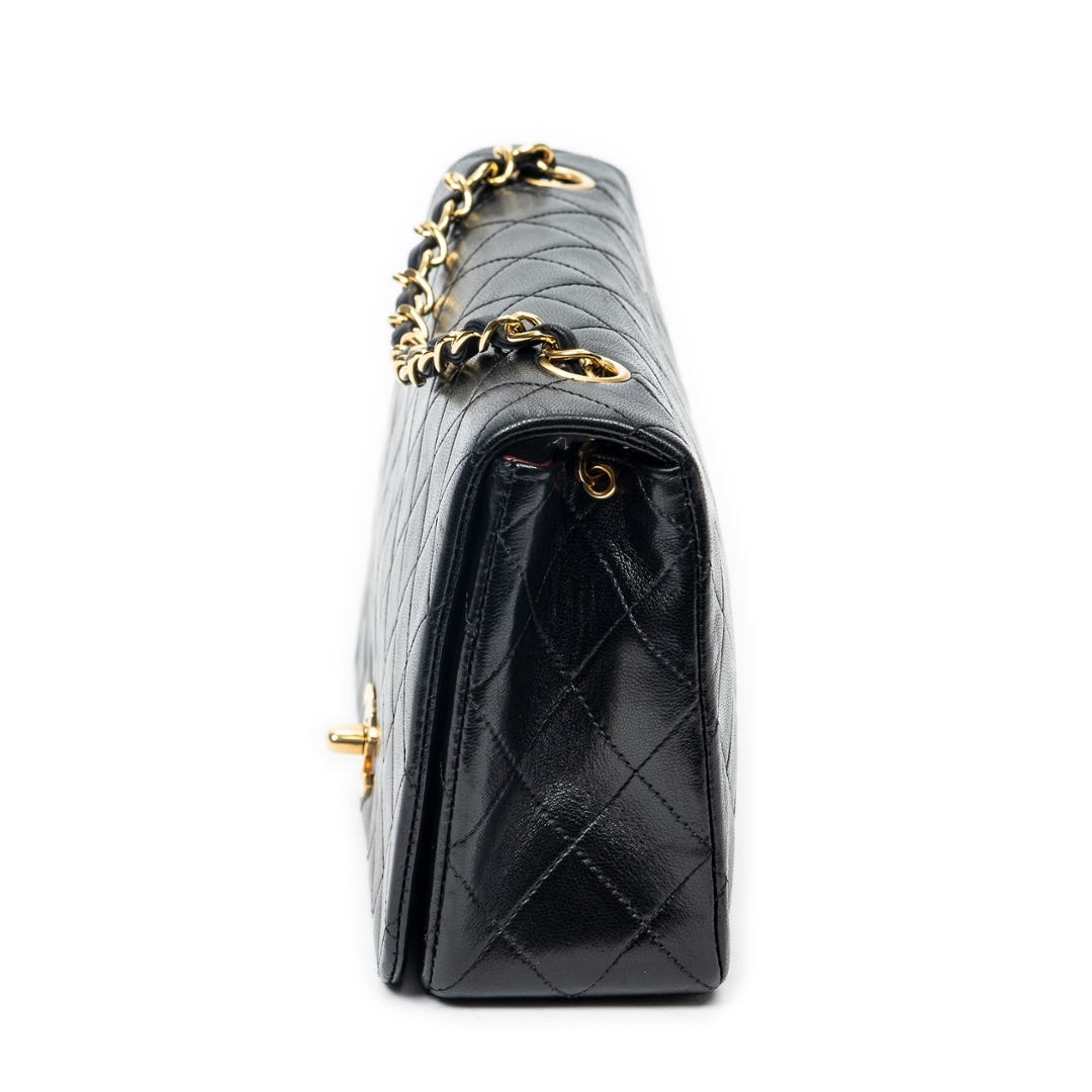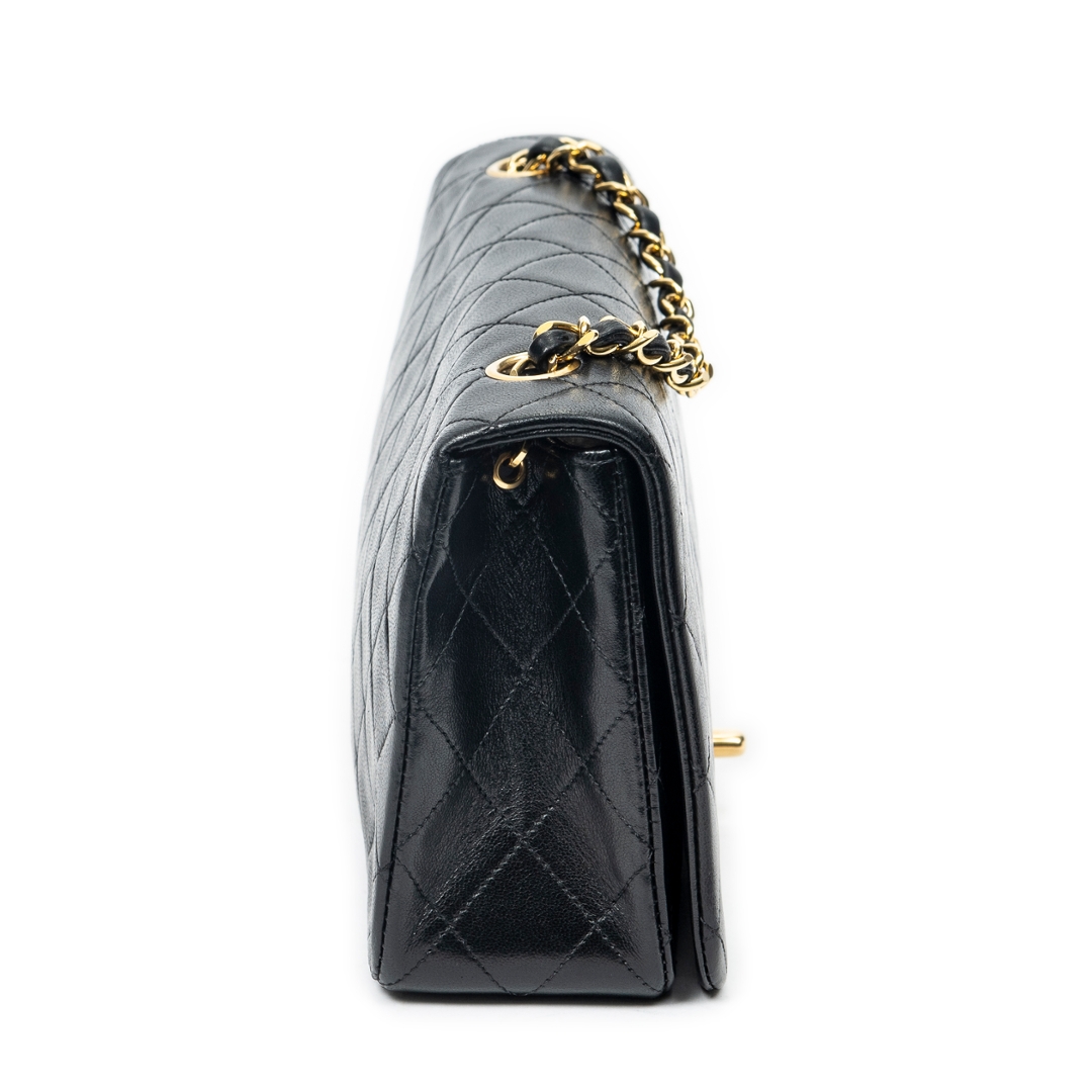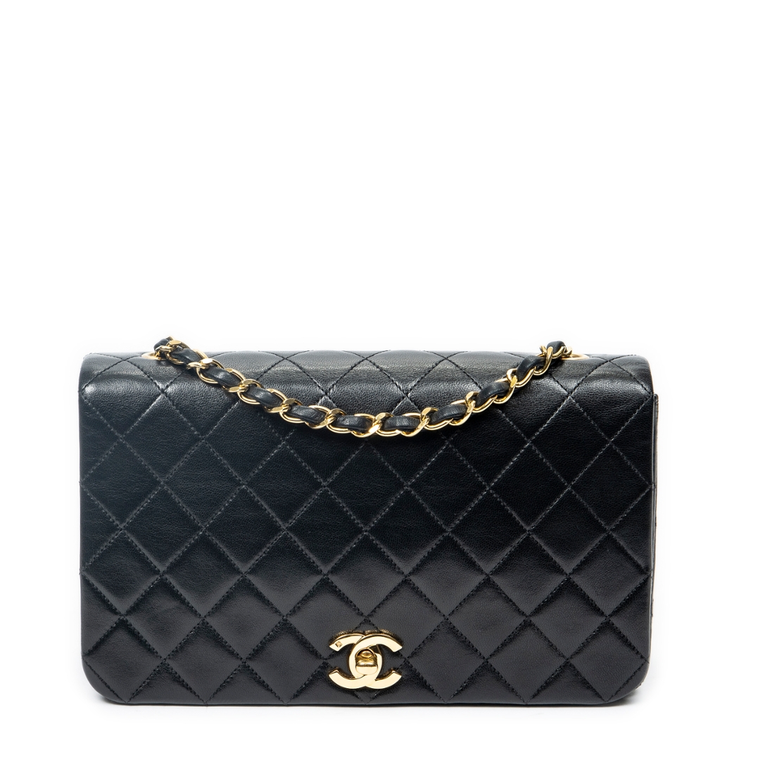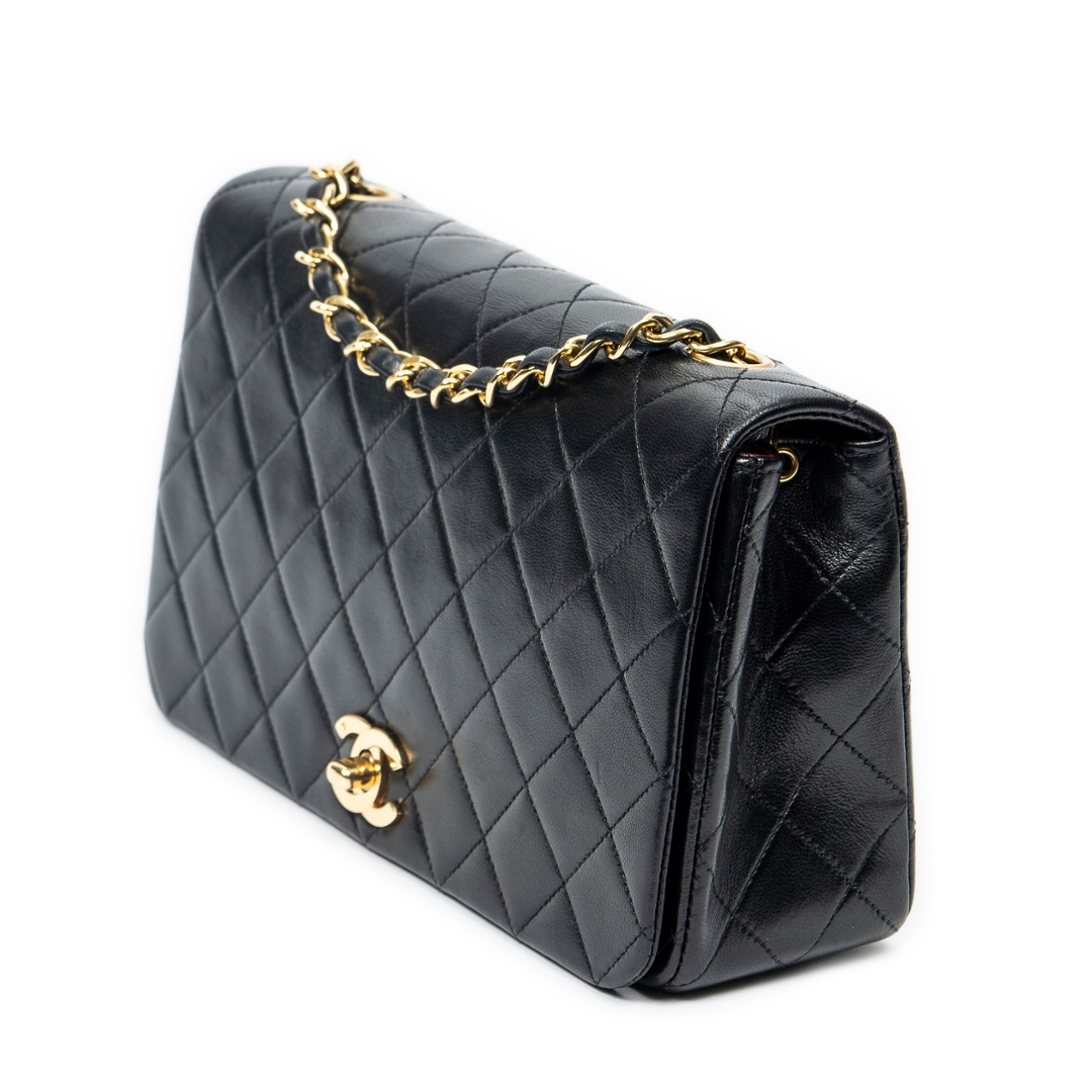 A vintage Chanel black quilted lambskin leather Mademoiselle Full Flap bag, an elegant and timeless piece that reflects the house’s iconic design heritage. Crafted from supple lambskin leather, the signature diamond quilting enhances the structured silhouette, while the classic CC turn-lock fastening in gold-tone hardware delivers an instantly recognisable and refined focal point.