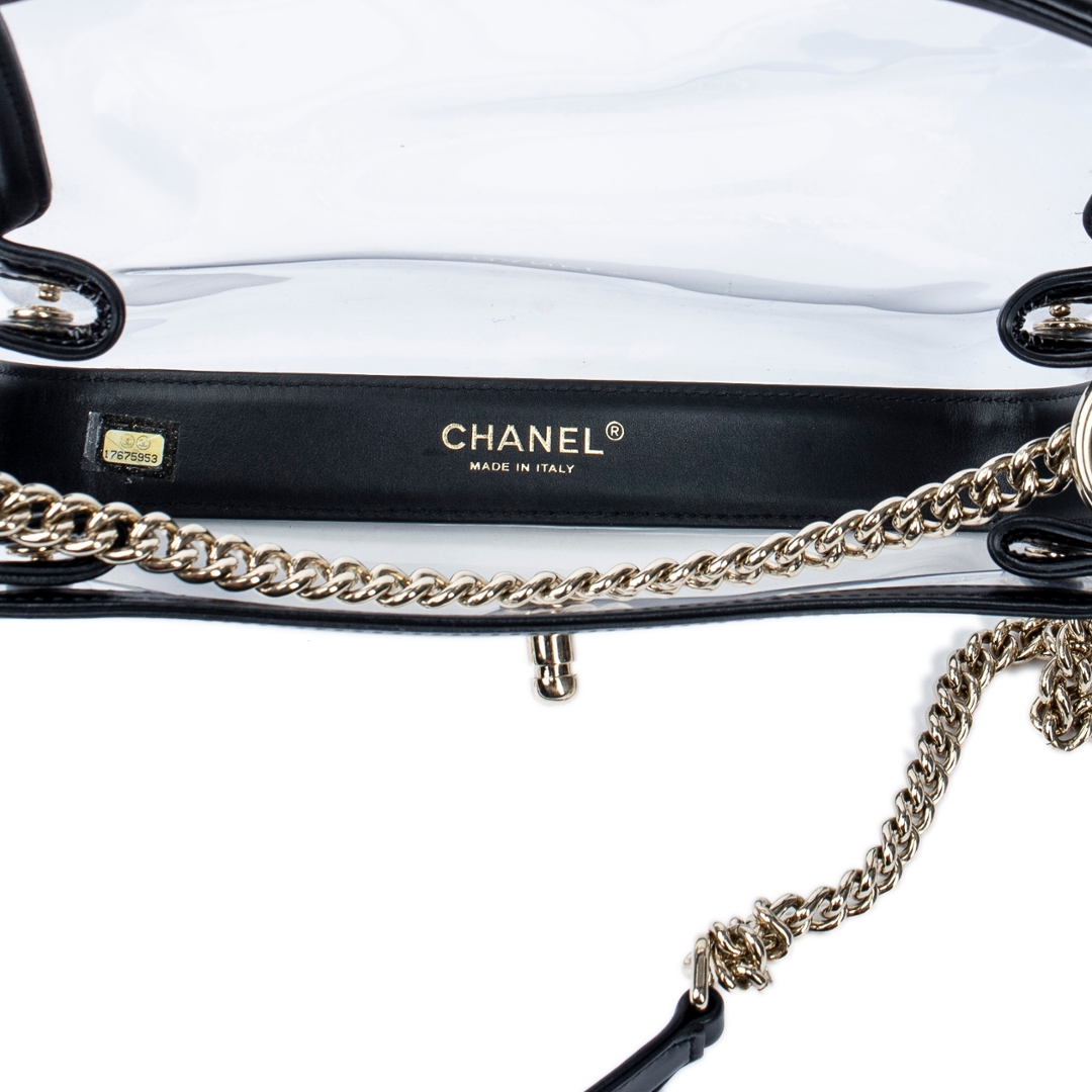 A Black and Transparent vintage Chanel CC Medium Flap Transparent Bag with a certificate of authenticity, Approximately 14cm height, 24cm width.