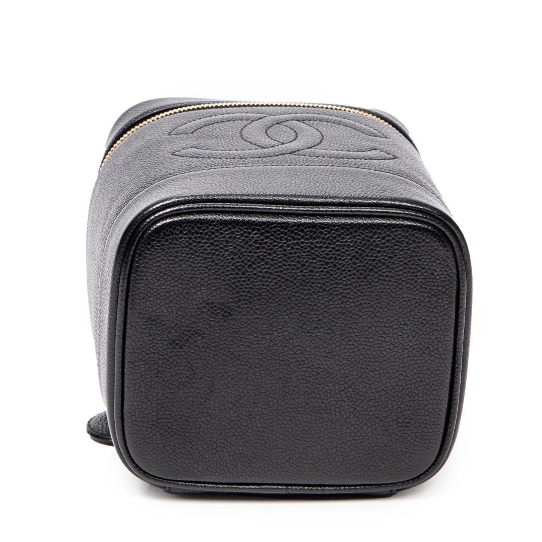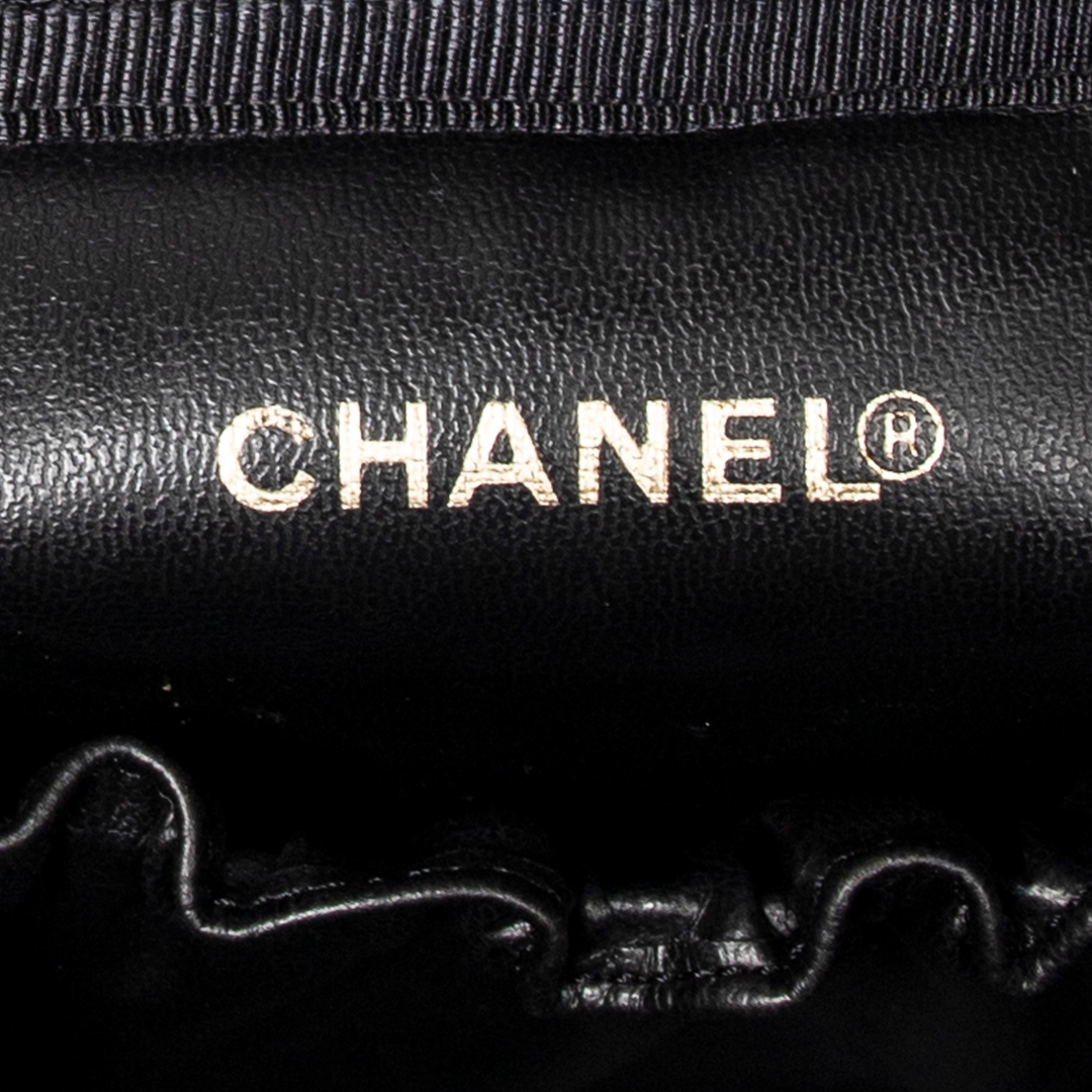 A vintage Chanel black calf leather Timeless Tall Vanity Case bag with a certificate of authenticity, Approximately 16cm height, 15cm width.