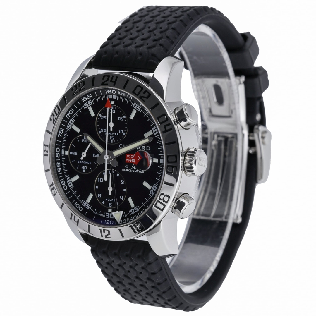 The 42mm stainless steel case is paired with a black rubber strap, while the black dial features contrasting sub-dials, a GMT function and a tachymeter scale, delivering strong motorsport character and everyday practicality. Powered by an automatic chronometer-rated movement, this model reflects Chopard’s long-standing partnership with the iconic Mille Miglia rally.