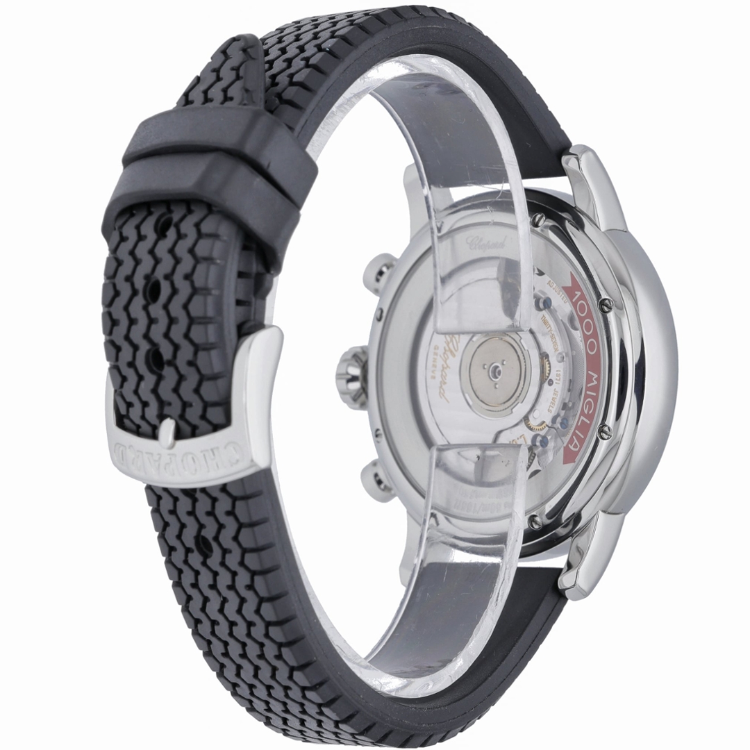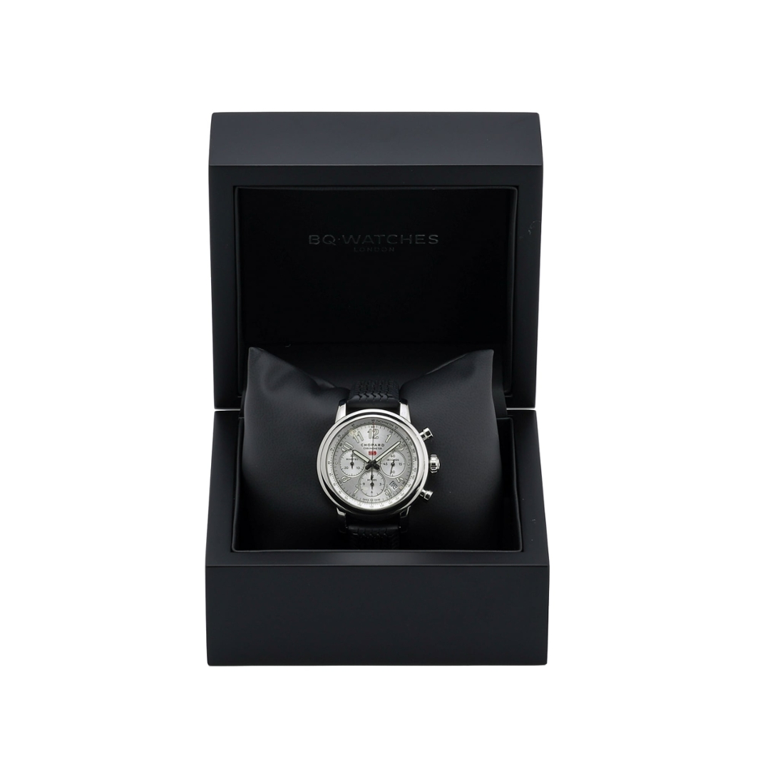 The 42mm stainless steel case frames a silver dial featuring bold Arabic numerals and three chronograph sub-dials positioned at 3, 6, and 9 o’clock, measuring seconds, hours, and minutes. A tachymeter scale runs around the outer edge of the dial, allowing speed calculations over distance while reinforcing the watch’s racing heritage. The distinctive red Mille Miglia arrow logo sits beneath the Chopard signature, referencing the iconic road race, while a neatly positioned date aperture is positioned between 4 and 5 o’clock. Powering the watch is an automatic chronometer-certified movement, delivering reliable and precise performance.