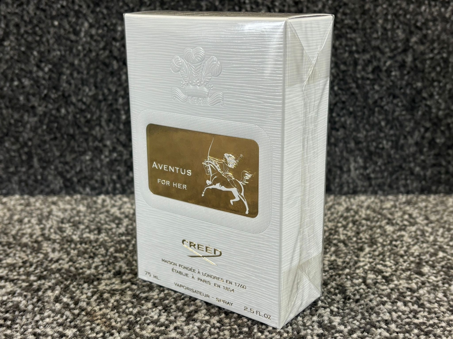 A 75ml bottle of Creed Aventus For Her Eau De Parfum, presented in its elegant branded presentation box, a fragrance that captures confidence, femininity and contemporary luxury. Created by the House of Creed, Aventus For Her is the bold counterpart to the iconic Aventus, celebrating strength and individuality. The refined white and gold packaging, finished with the signature equestrian emblem, reflects the heritage and prestige synonymous with the Creed name.