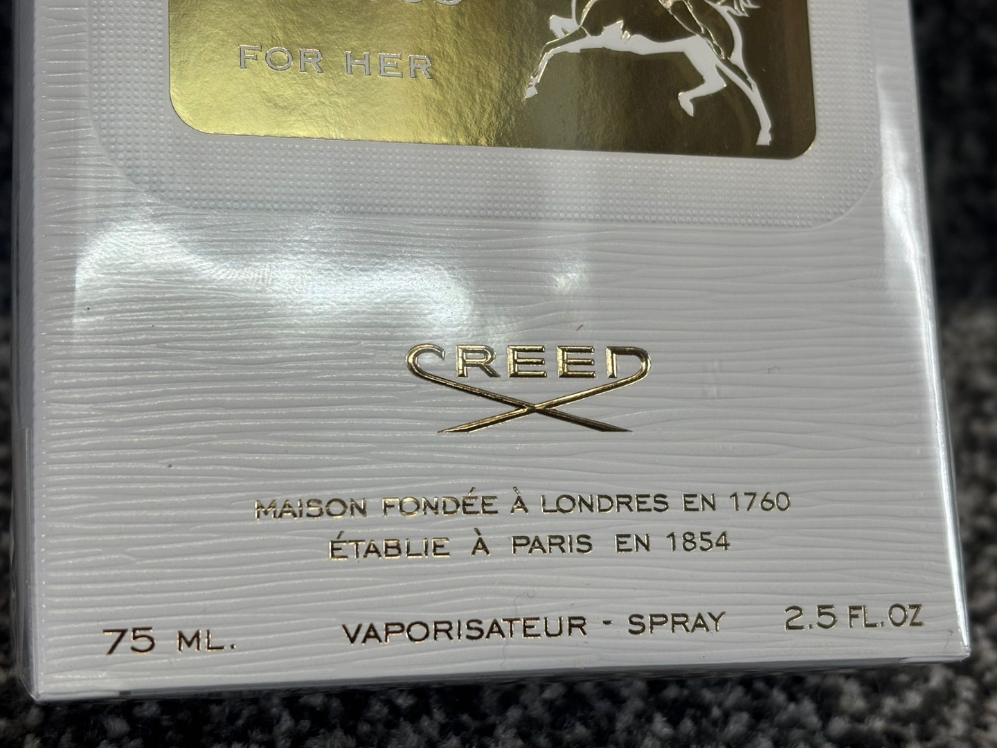 A 75ml bottle of Creed Aventus For Her Eau De Parfum, presented in its elegant branded presentation box, a fragrance that captures confidence, femininity and contemporary luxury. Created by the House of Creed, Aventus For Her is the bold counterpart to the iconic Aventus, celebrating strength and individuality. The refined white and gold packaging, finished with the signature equestrian emblem, reflects the heritage and prestige synonymous with the Creed name.