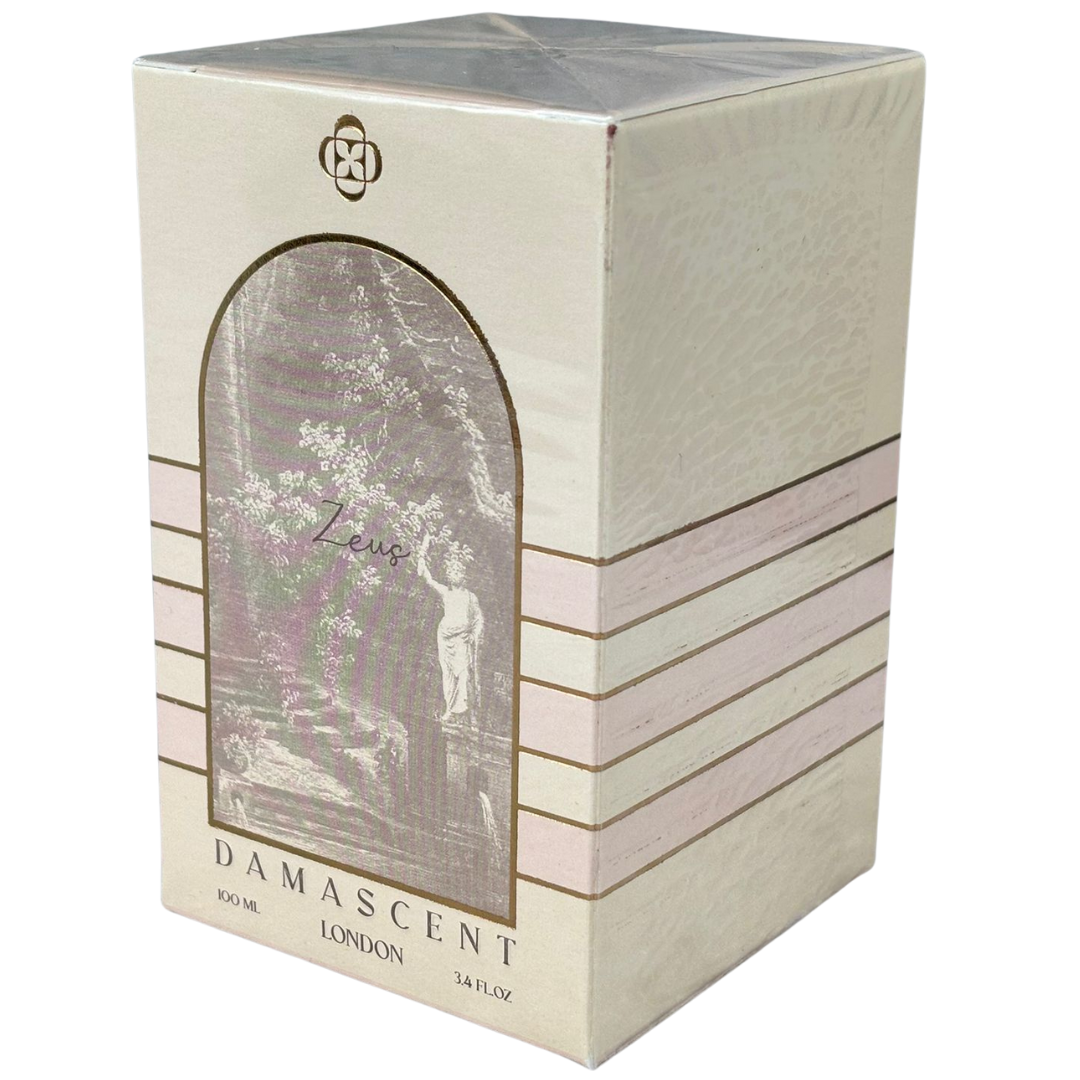 A bottle of Damascent - Zeus Parfum in a presentation box.