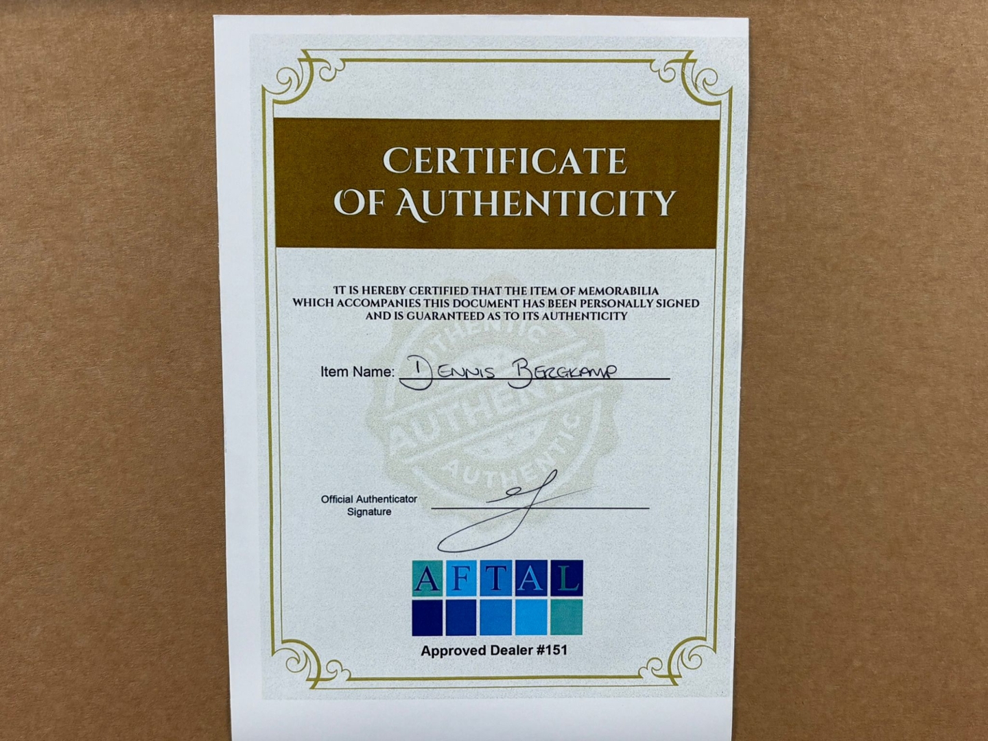 A signed and authenticated Dennis Bergkamp Netherlands picture in a presentation frame. Approx 68cm height, 58cm width.