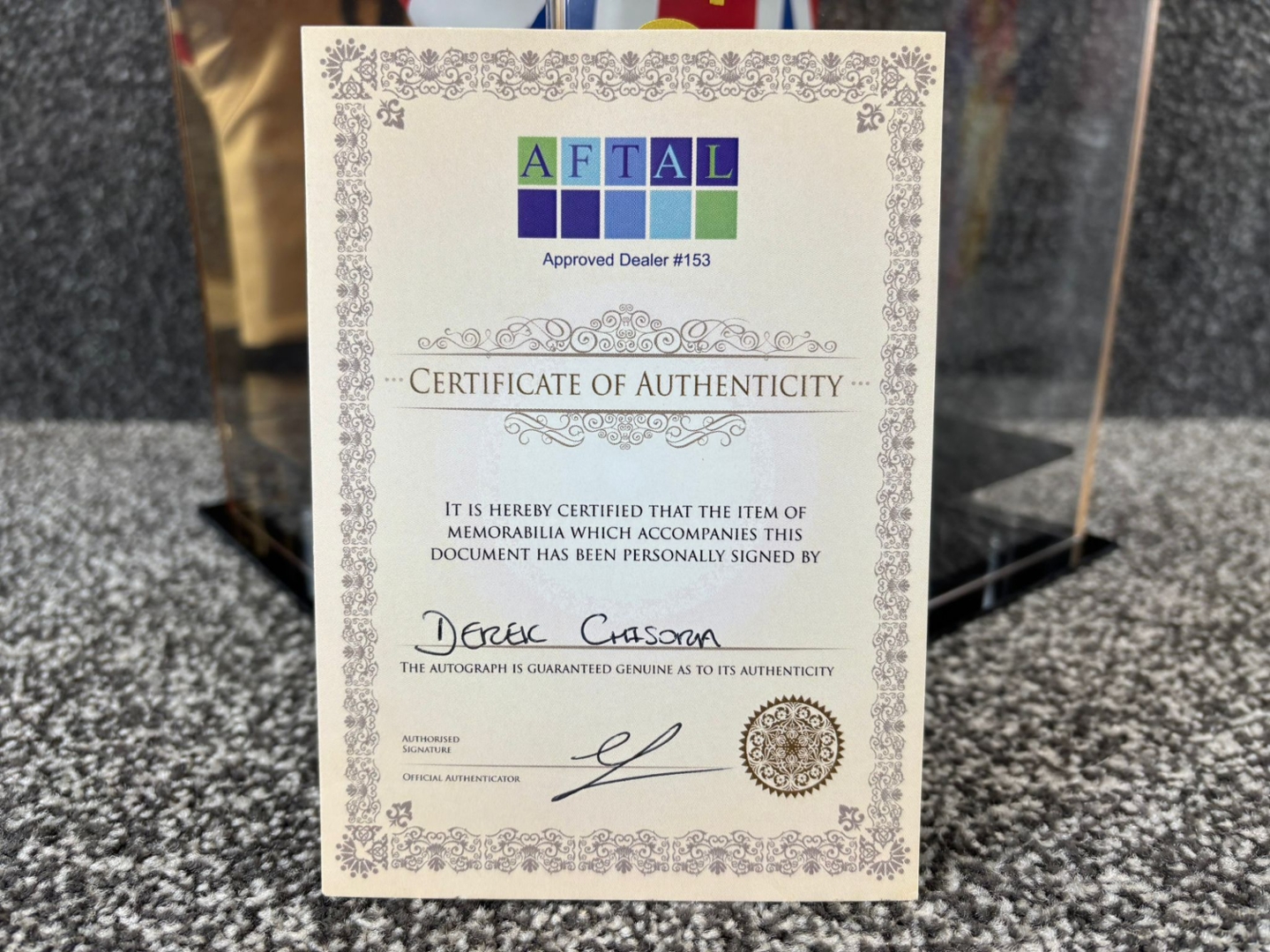 A striking piece of boxing memorabilia, this signed Union Jack glove represents the relentless spirit and personality of Derek Chisora. Known for his explosive fighting style and enduring presence in the heavyweight division, Chisora has built a loyal following throughout his career, making signed items such as this highly desirable among collectors and fans of the sport.