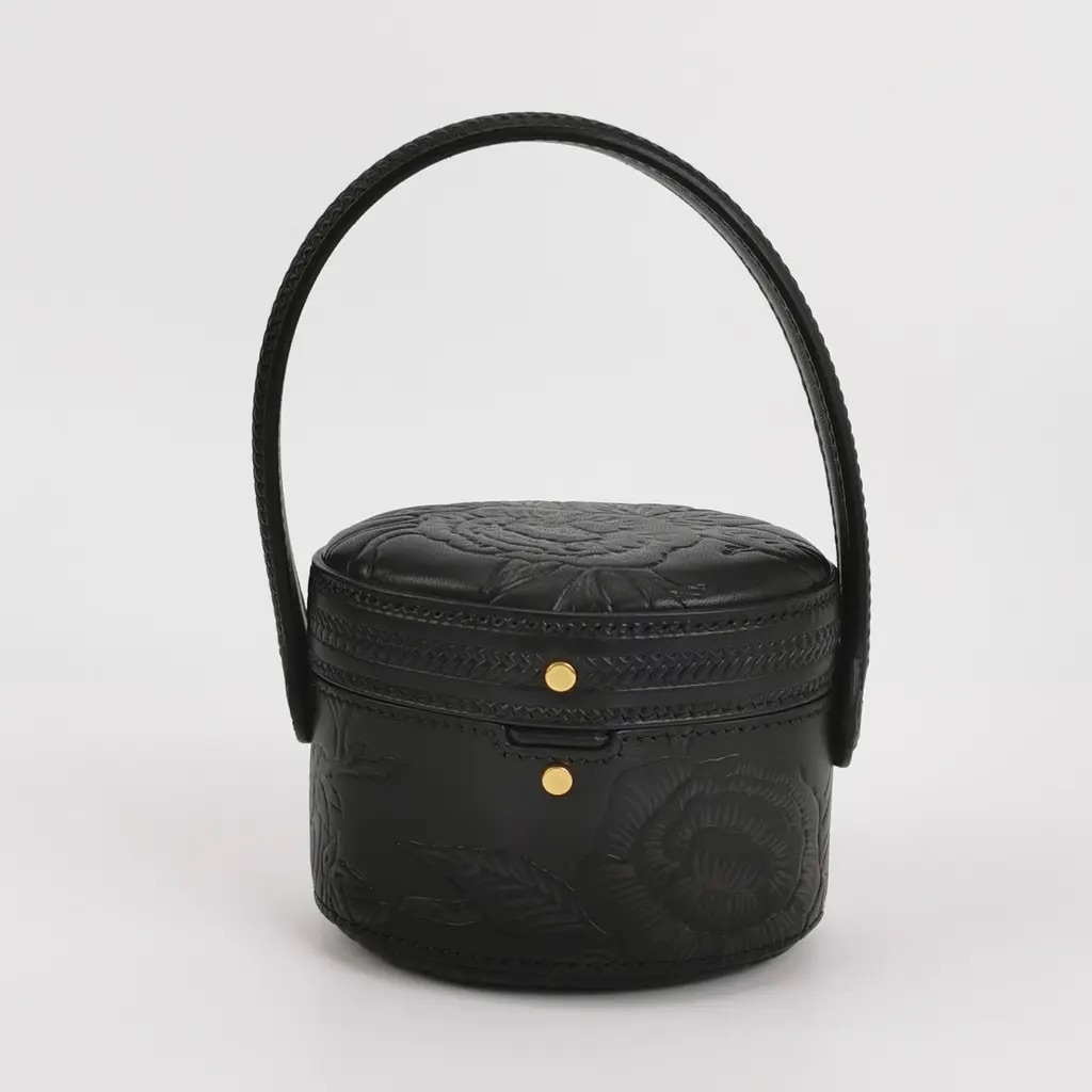 A Dior black embossed leather mini vanity case, crafted in a structured, rounded silhouette that delivers both elegance and statement appeal. The intricate embossed pattern subtly enhances the leather, creating depth and texture, while the gold-tone CD clasp at the front provides a striking focal point and unmistakable signature finish. A curved top handle completes the design, adding a refined and distinctive touch.