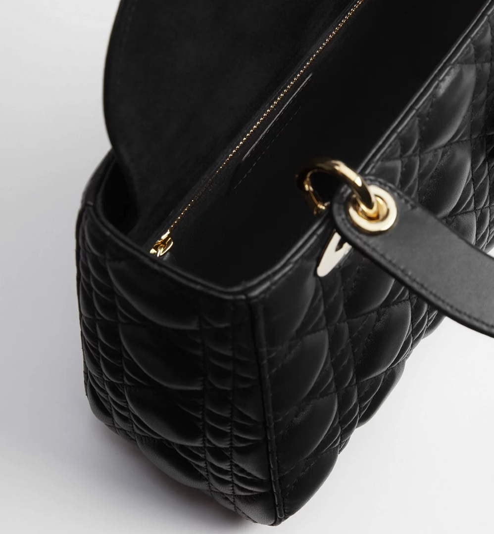 A Dior black Cannage quilted leather Lady Dior mini bag, embodying the house’s most iconic design language in a compact, refined format. The signature Cannage stitching creates a structured, geometric texture across the supple leather, while gold-tone hardware enhances the contrast with a luxurious finish. The instantly recognisable Dior charm set adds movement and character, delivering a distinctive and highly sought-after aesthetic.