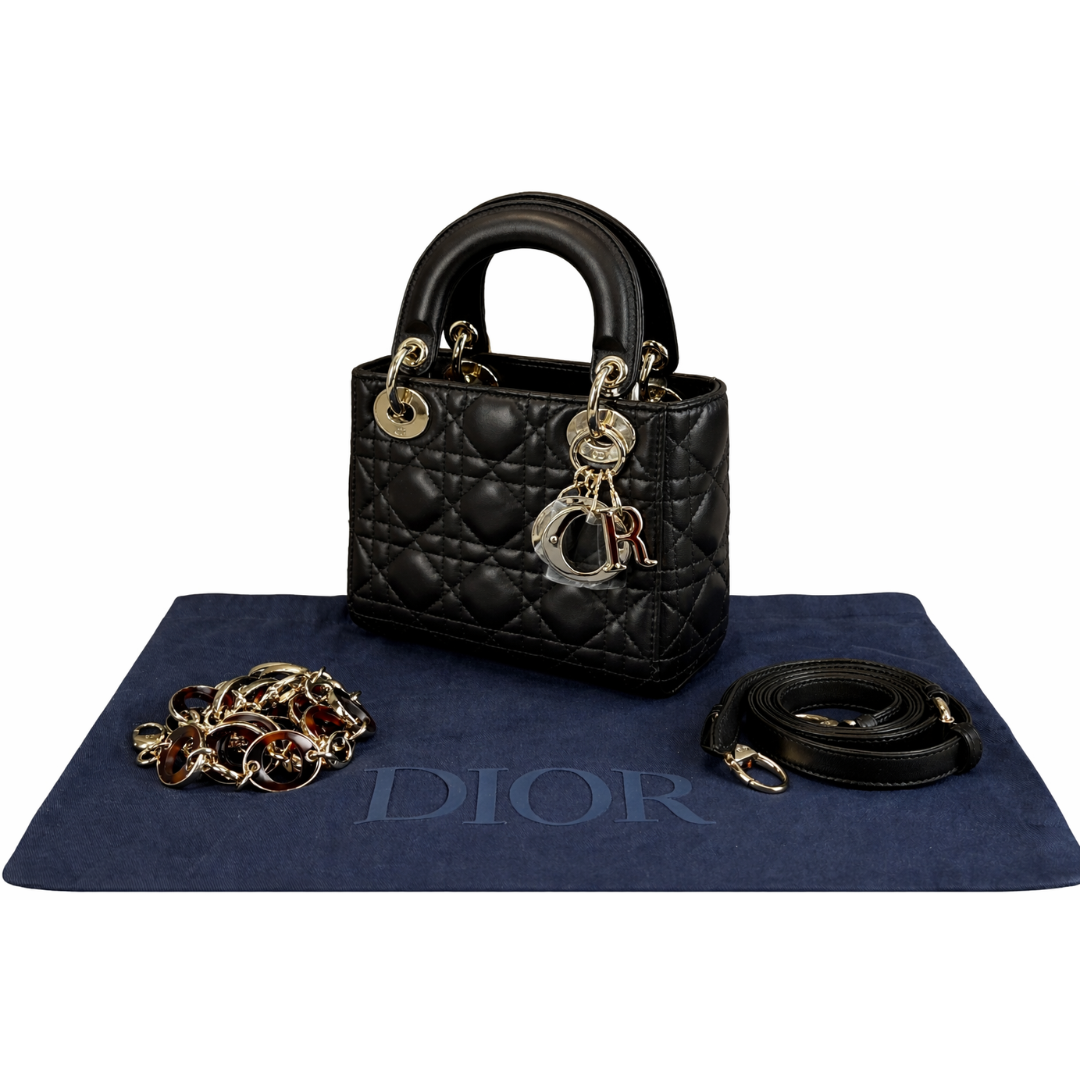 A brand new Dior Black Cannage Quilted Leather Lady Dior Mini Bag with Gold-Tone Hardware & Charm Set, Approximately 15cm height, 18cm width.
