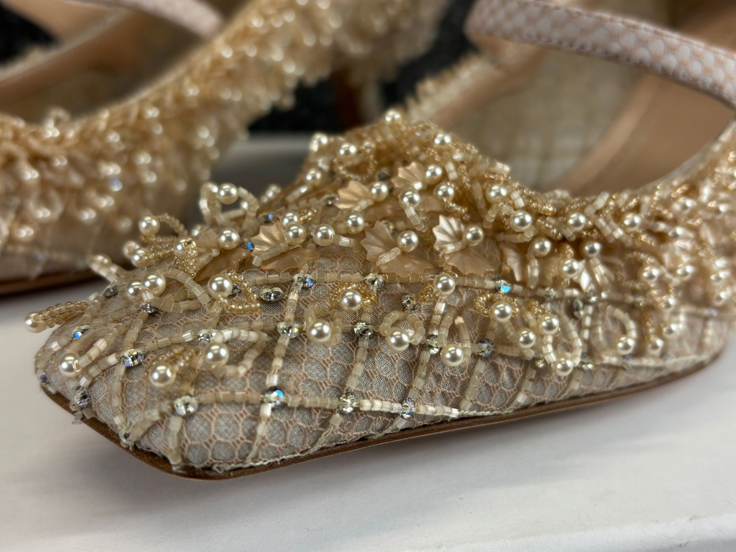 A Dior Haute Couture nude embellished mesh pumps, showcasing exceptional craftsmanship and intricate detailing synonymous with the house’s most exclusive creations. The delicate mesh upper is richly adorned with hand-applied pearls, beads, and embroidery, creating a textured, dimensional finish that catches the light beautifully. The elegant silhouette is further enhanced by a refined strap detail, adding both structure and a graceful, feminine touch.