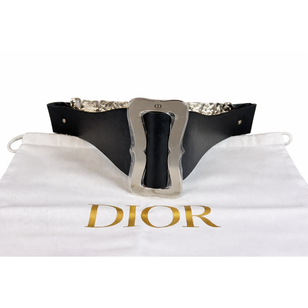 - > Dior Leather Belt with Sculpted Silver-Tone Statement Buckle.