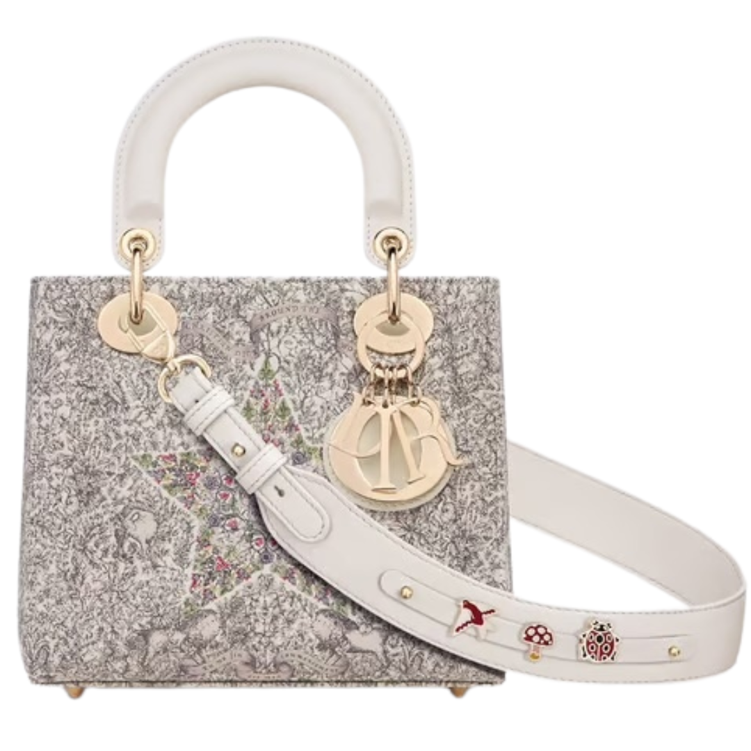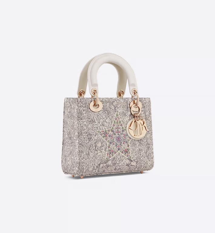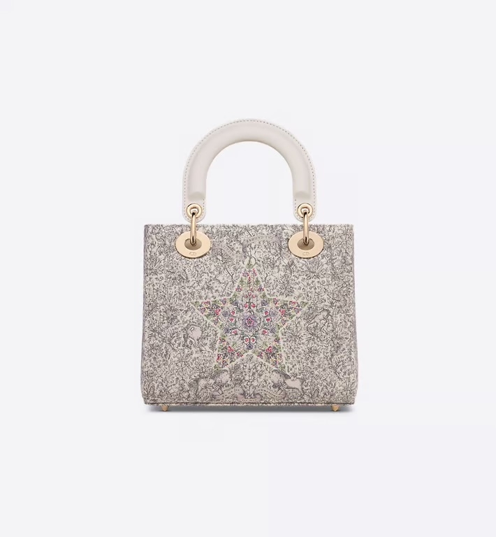 A brand new Dior Lady Dior Star tote bag, crafted from printed canvas with smooth leather trim, showcasing a distinctive and artistic interpretation of the house’s iconic silhouette. The intricate monochrome toile-style print is elevated by a central star motif adorned with delicate floral detailing, creating a unique and highly collectible design that blends heritage inspiration with contemporary flair.