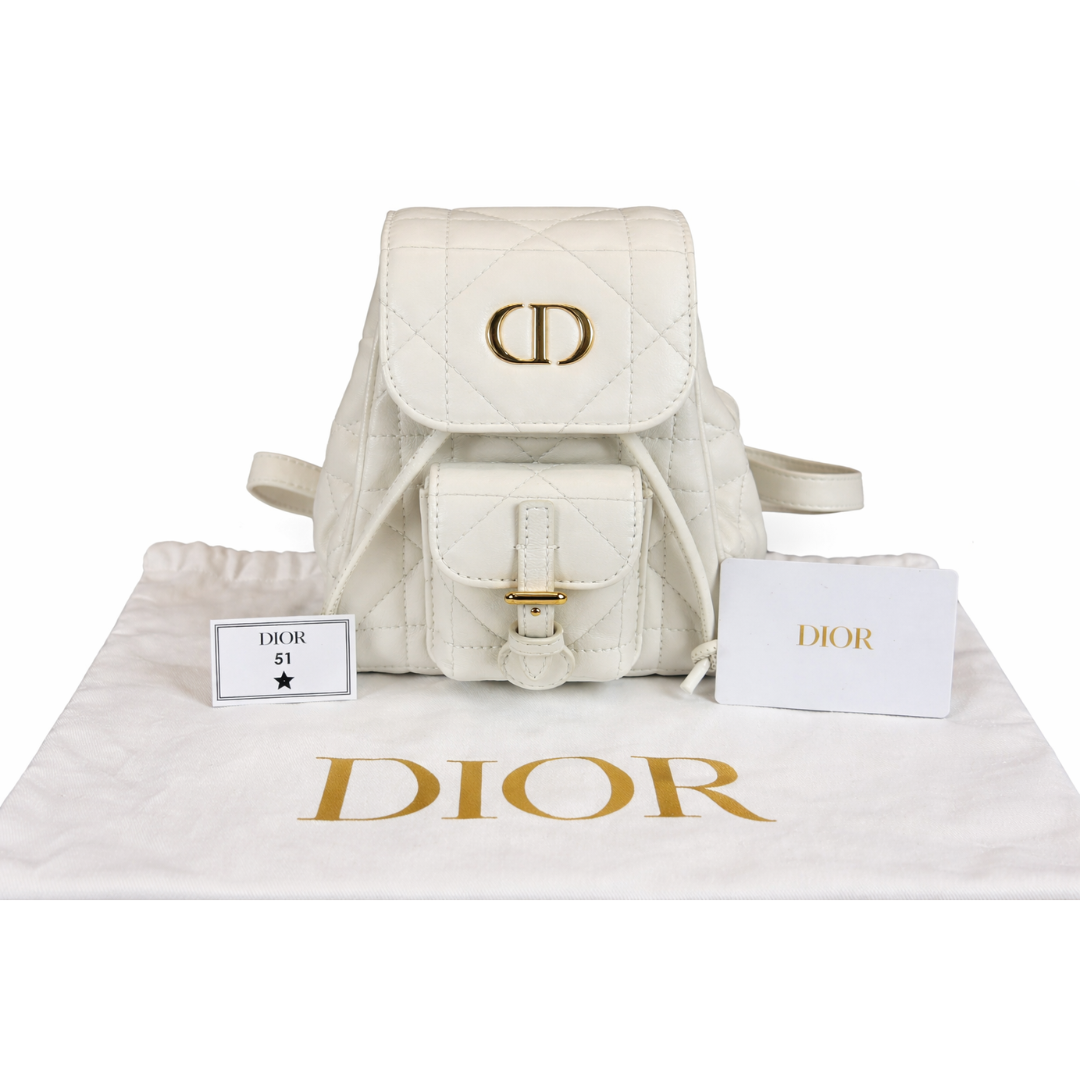 A brand new Dior White Quilted Leather Mini Backpack with Gold-Tone CD Logo, Approximately 16cm height, 15cm width.