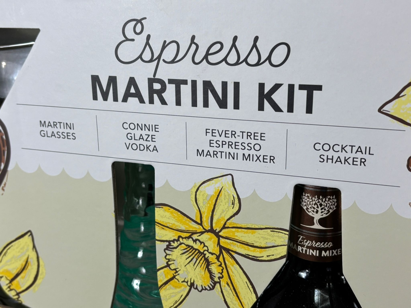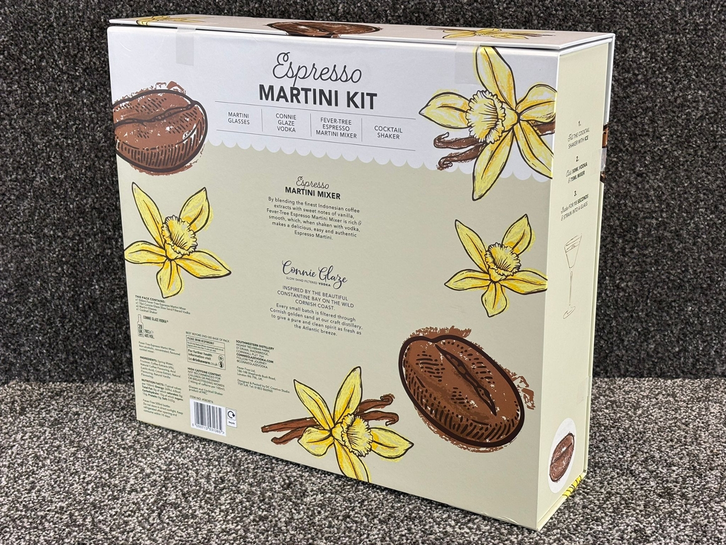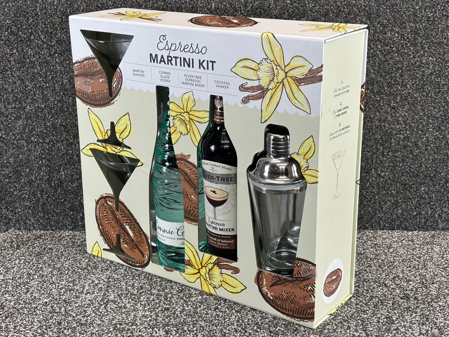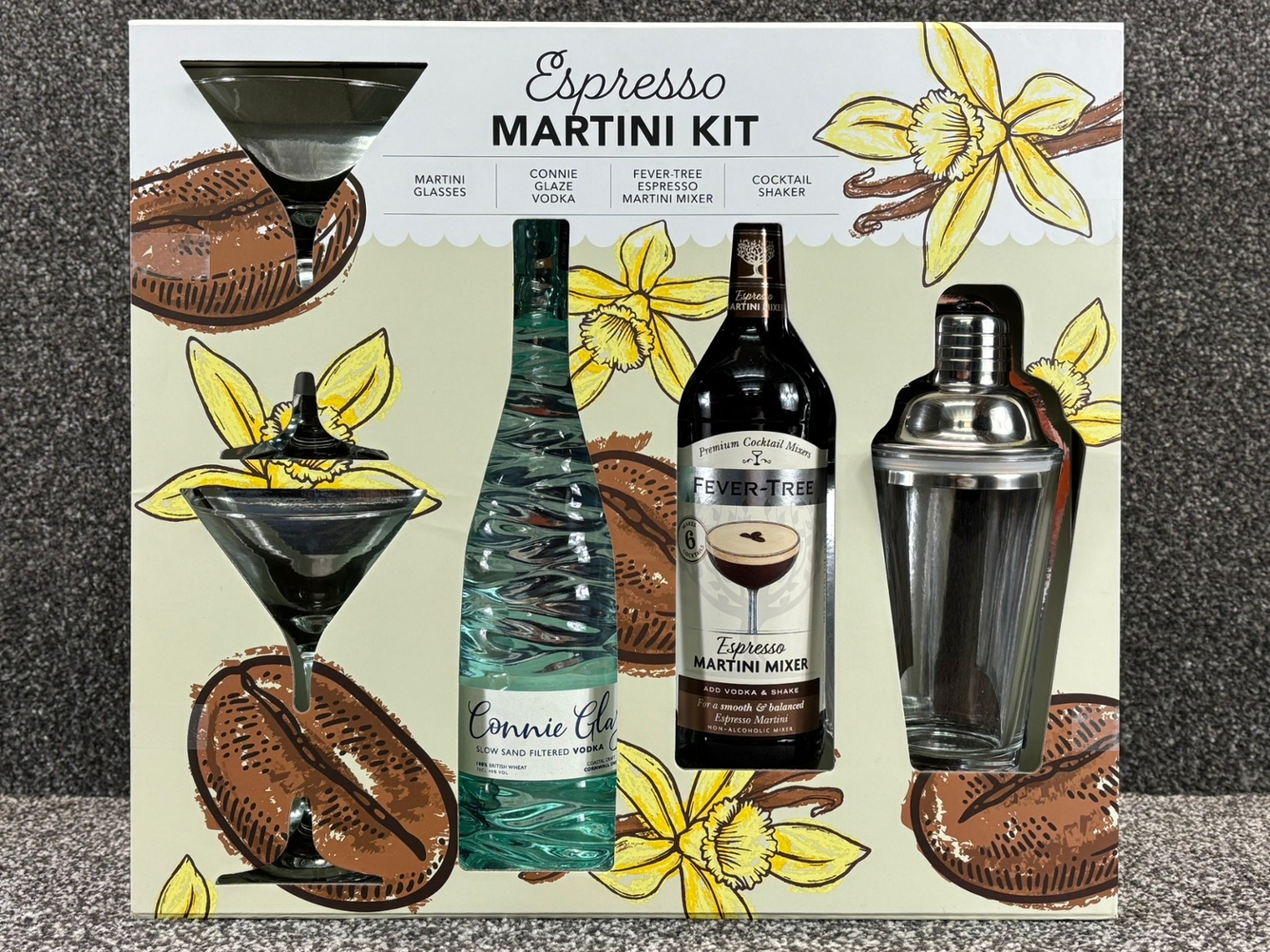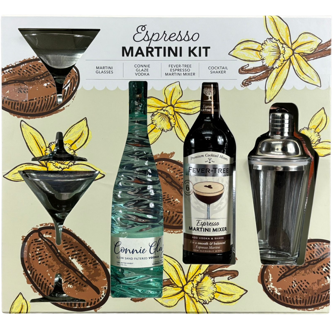 An Espresso Martini Kit including Fever-Tree Espresso Martini Mixer, Connie Glaze Vodka, Cocktail Shaker & 2 x Martini Glasses in a presentation box. 70cl.