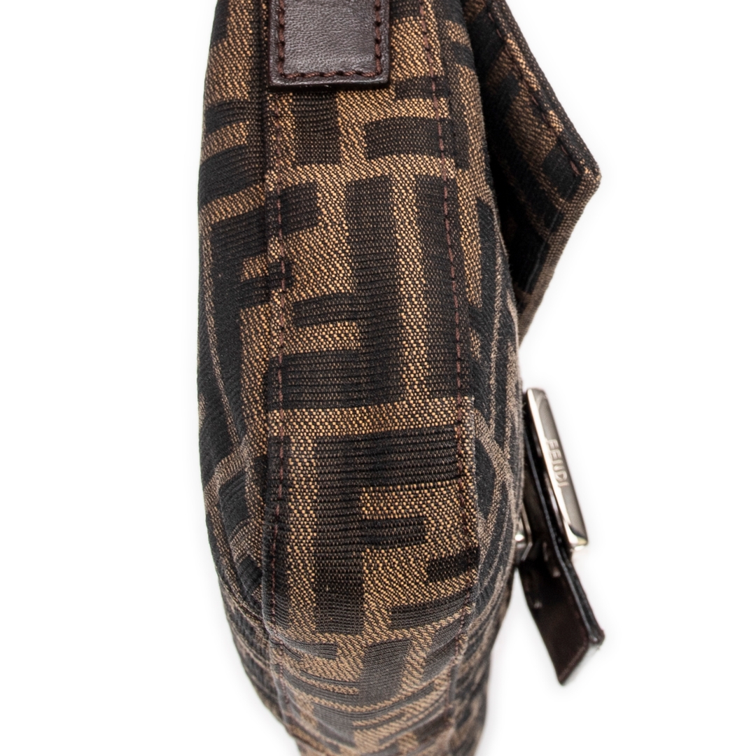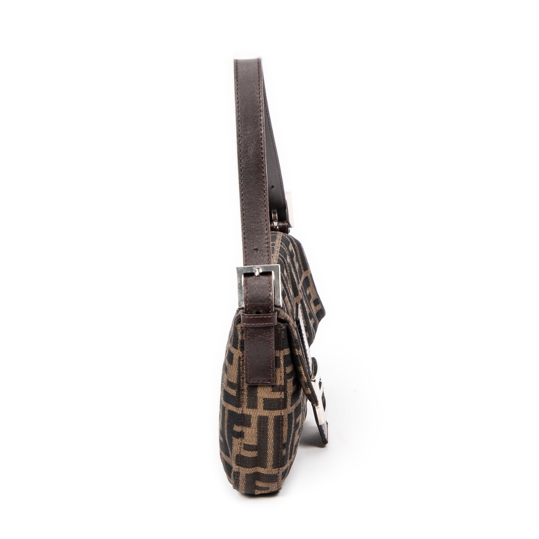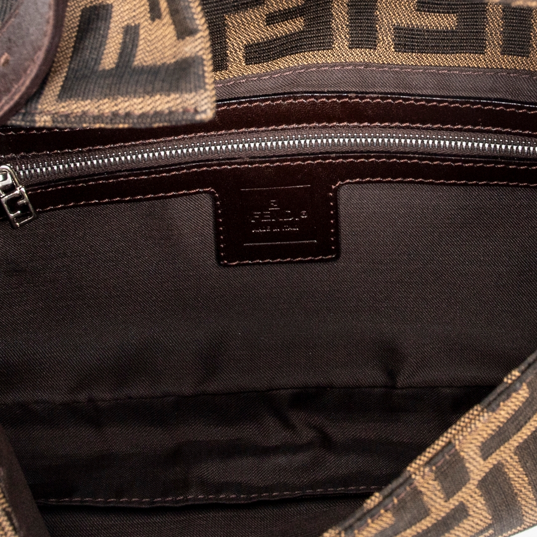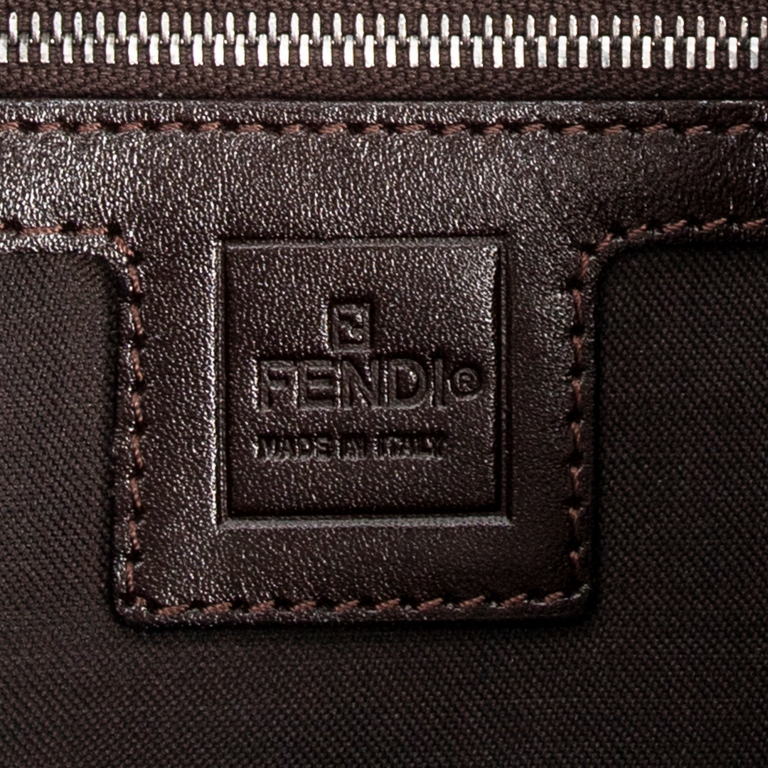 A vintage Fendi khaki/dark brown canvas Baguette bag with a certificate of authenticity, Approximately 14cm height, 26cm width.
