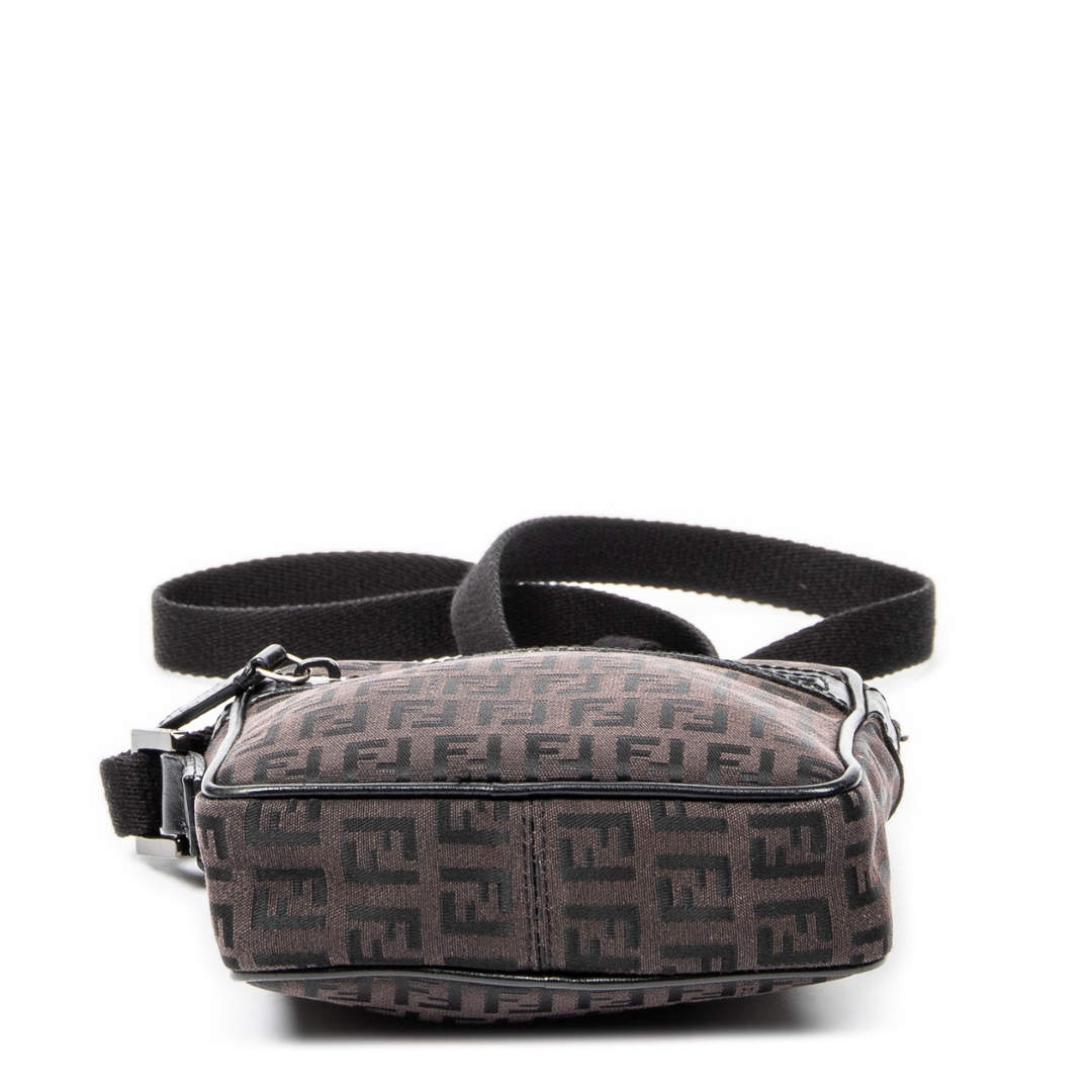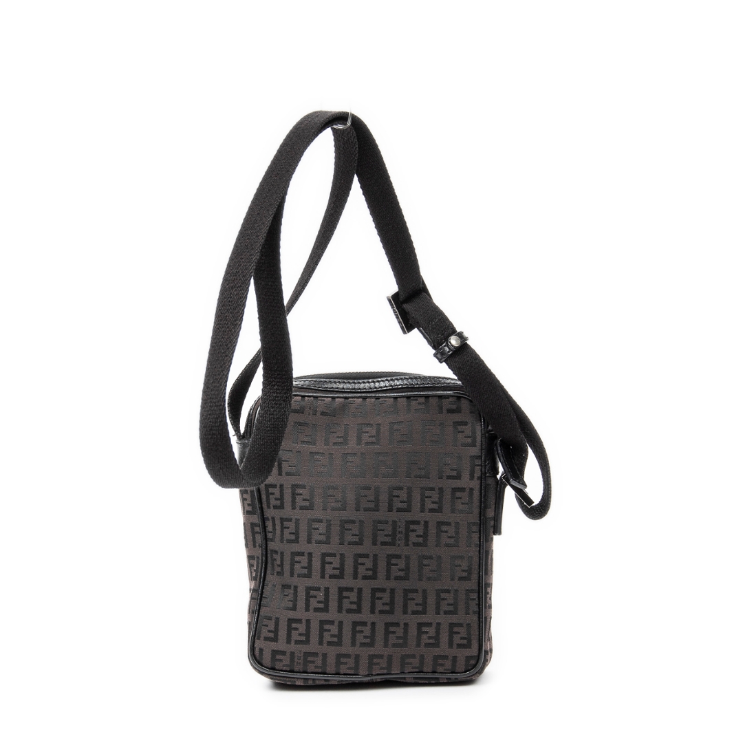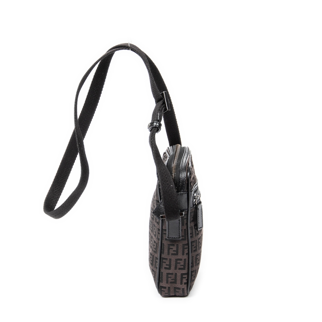 A vintage Fendi dark brown/black canvas Front Pocket Crossbody bag with a certificate of authenticity. Approximately 18cm height, 15cm width.
