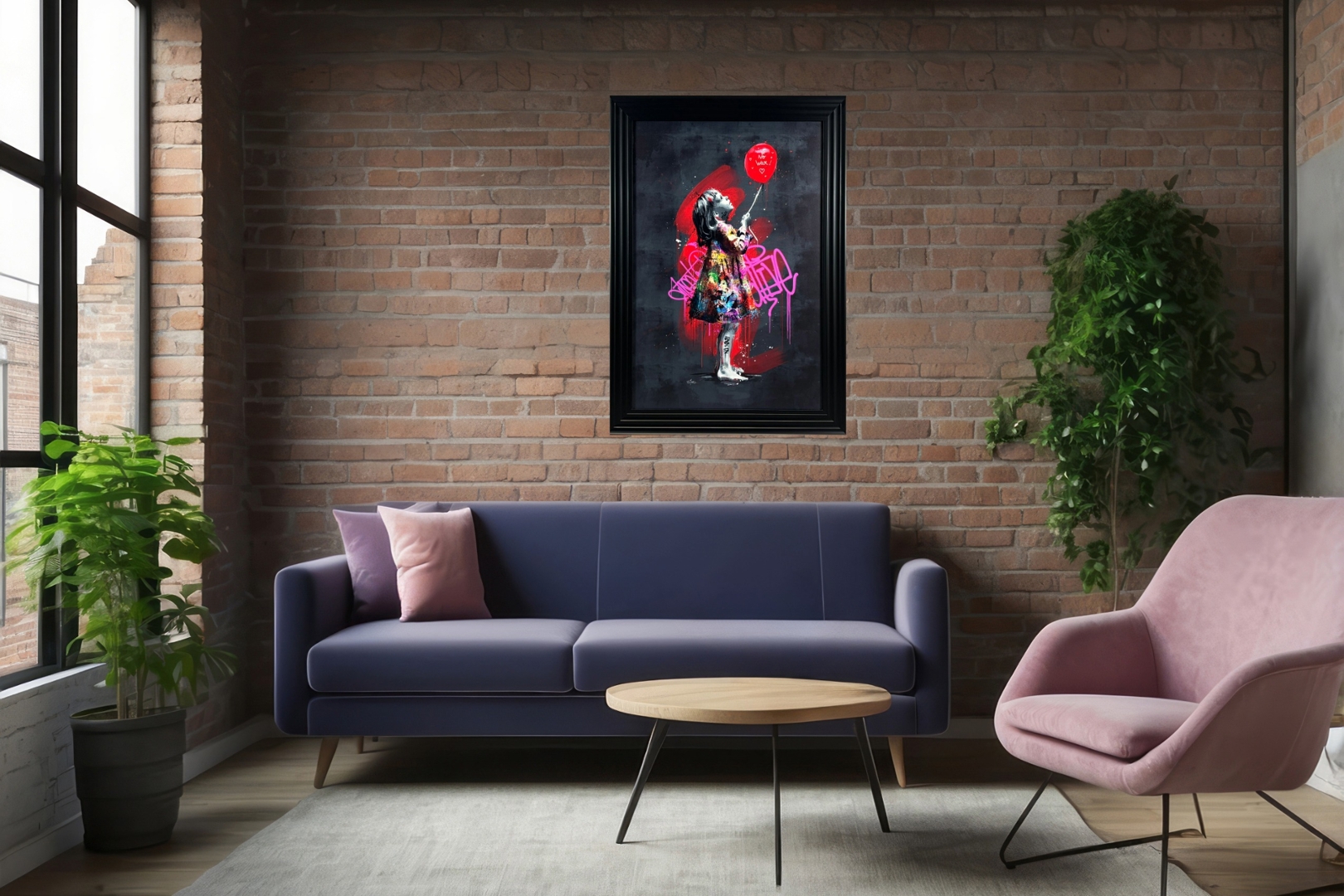 A brand new black-framed Clear Coat Overlay Art Picture that delivers a powerful message through bold, urban-inspired design — this captivating piece features a young girl holding a red balloon with the words “No War” delicately inscribed. Measuring 105cm in height and 75cm in width, it’s a visually striking statement on peace, innocence, and resistance.