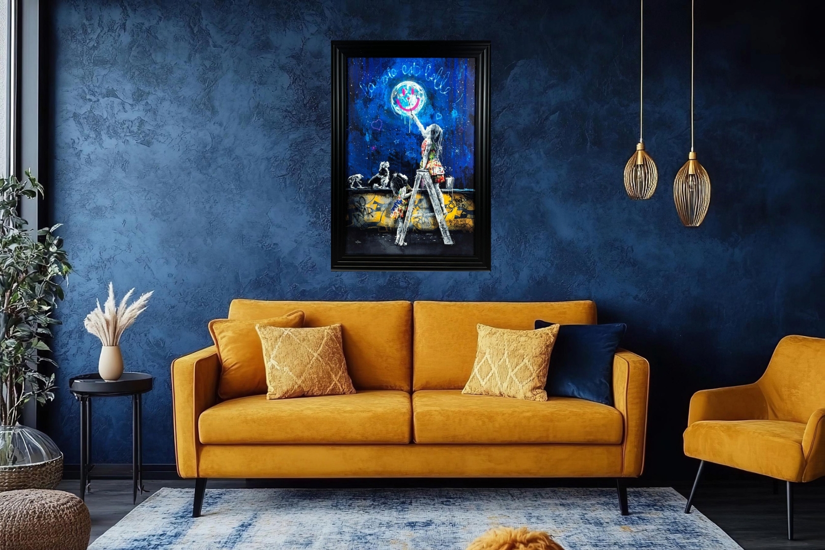 A brand new black-framed Clear Coat Overlay Art Picture that radiates hope, imagination, and childlike wonder — this enchanting piece features a young girl painting a smiley face onto the moon under a glowing night sky. Measuring 105cm in height and 75cm in width, it’s a heartwarming blend of street art, storytelling, and emotional impact.
