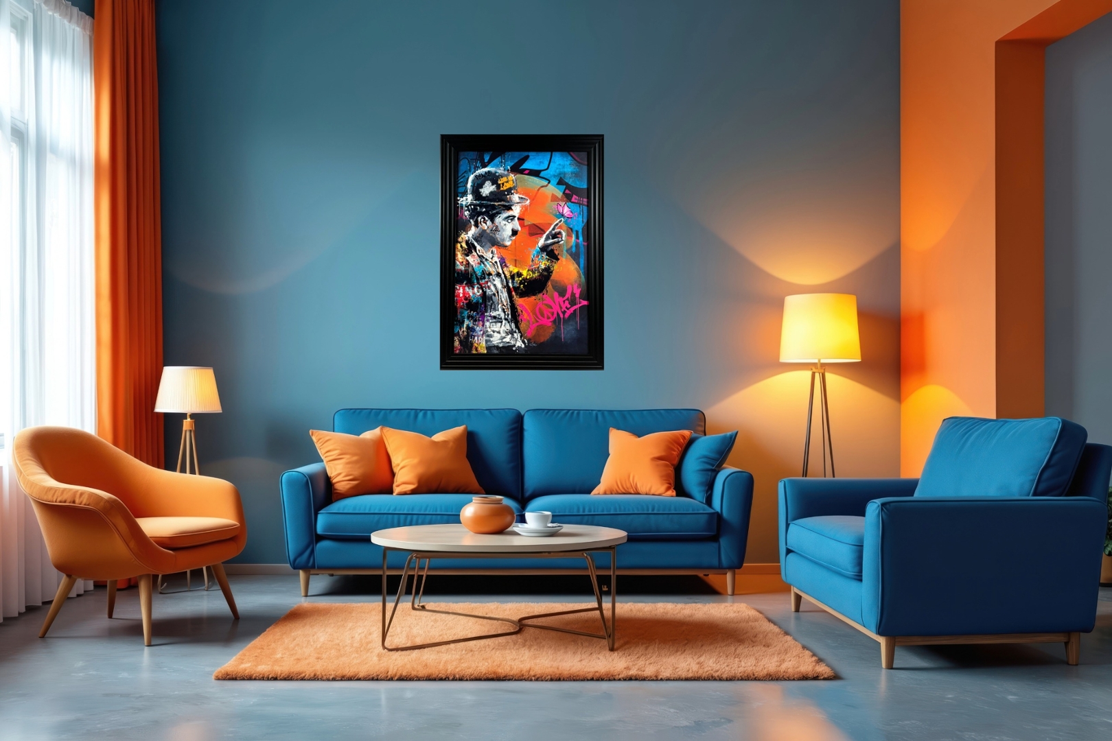 A brand new black-framed Clear Coat Overlay Art Picture that brings vintage cinema charm into the heart of modern street art — this dynamic piece features an electrifying graffiti-style depiction of the legendary Charlie Chaplin. Measuring 105cm in height and 75cm in width, it's a bold collision of classic iconography and contemporary urban expression.
