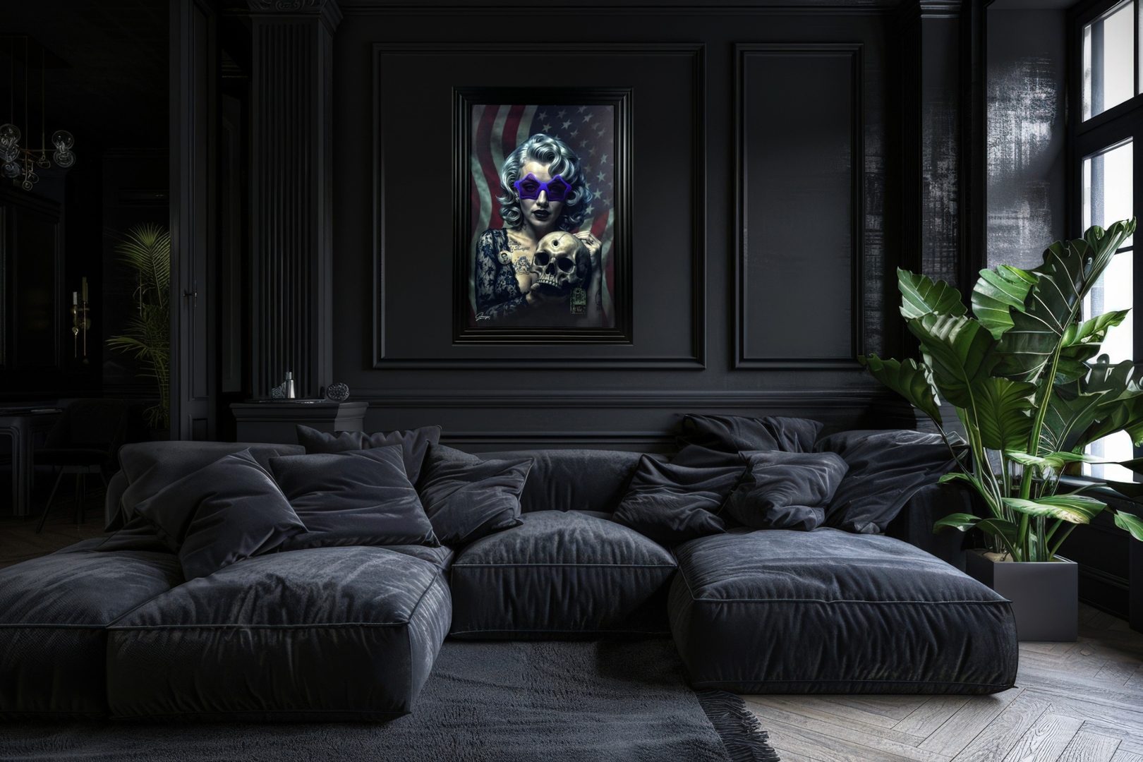 A brand new black-framed Clear Coat Overlay Art Picture that combines vintage glamour with dark pop-art flair — this captivating artwork features a striking lady in bold purple star-shaped sunglasses, set against a dramatic backdrop of the American flag. Measuring 105cm in height and 75cm in width, it’s a daring visual that merges old-school Hollywood style with edgy rebellion.