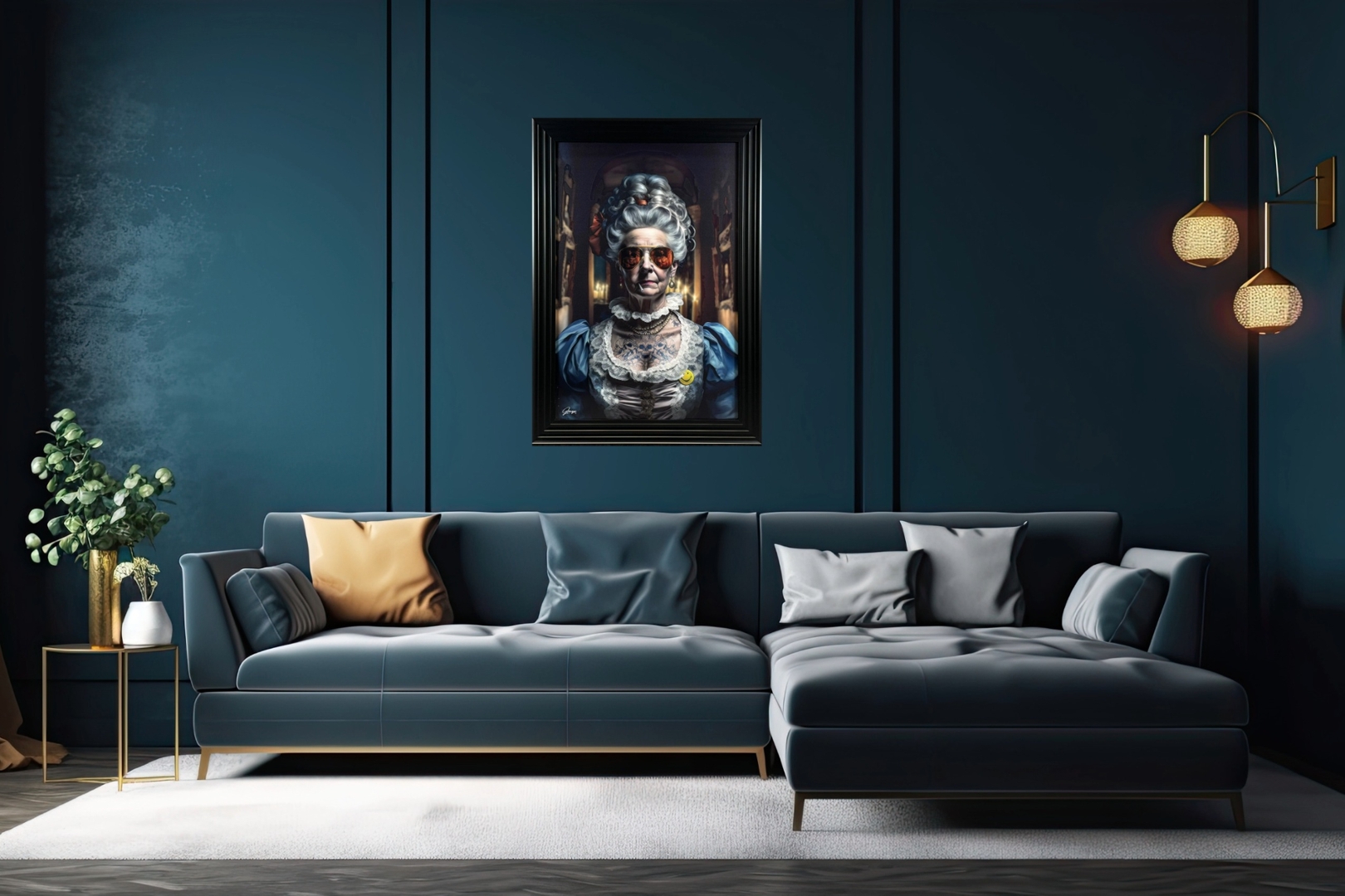 A brand new black-framed Clear Coat Overlay Art Picture reimagines classical elegance with a rebellious twist. Standing at an impressive 105cm tall and 75cm wide, it features a regal 18th-century lady — but not as you’ve ever seen her before. Dressed in traditional aristocratic attire with a high powdered wig and lace-trimmed bodice, she exudes vintage grace. Yet, her mirrored aviator sunglasses, chest tattoos of skull motifs, cigarette in hand, and cheeky yellow smiley-face badge reveal a fiercely modern, punk-inspired attitude that breaks all conventions.