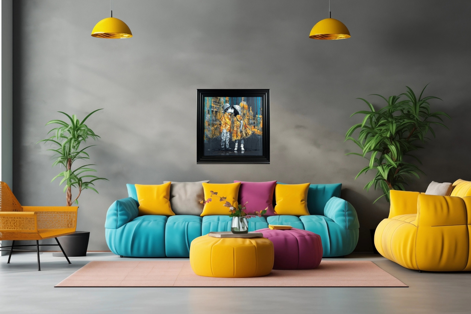 A brand new black-framed Clear Coat Overlay Art Picture that beautifully captures the innocence and sweetness of young love — this heartwarming piece features two children sharing a tender kiss in a romantic, European cityscape. Measuring 75cm in height and 75cm in width, it’s a charming square-format artwork that speaks to timeless affection and joy.