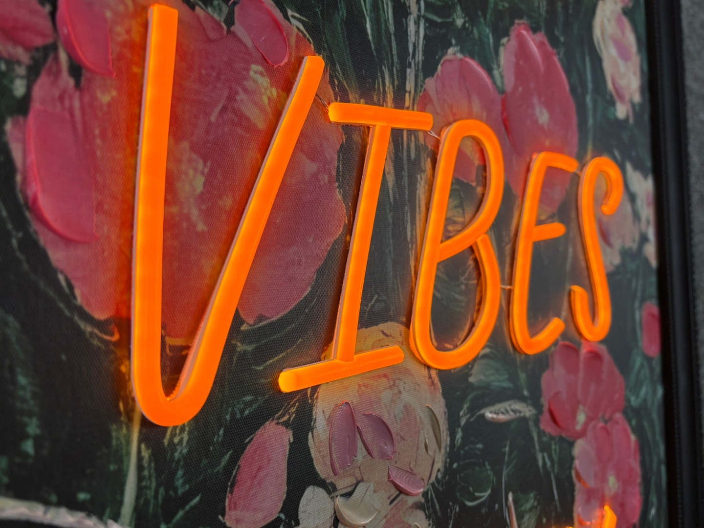 A framed LED wall art piece that radiates positivity, this vibrant design proudly displays the glowing message “Good Vibes Only” in neon-style illumination. Set against a lively floral backdrop of bold pink and red roses, the artwork combines the softness of painterly blooms with the energetic glow of LED lighting, creating a striking contrast that immediately lifts the atmosphere of any room.