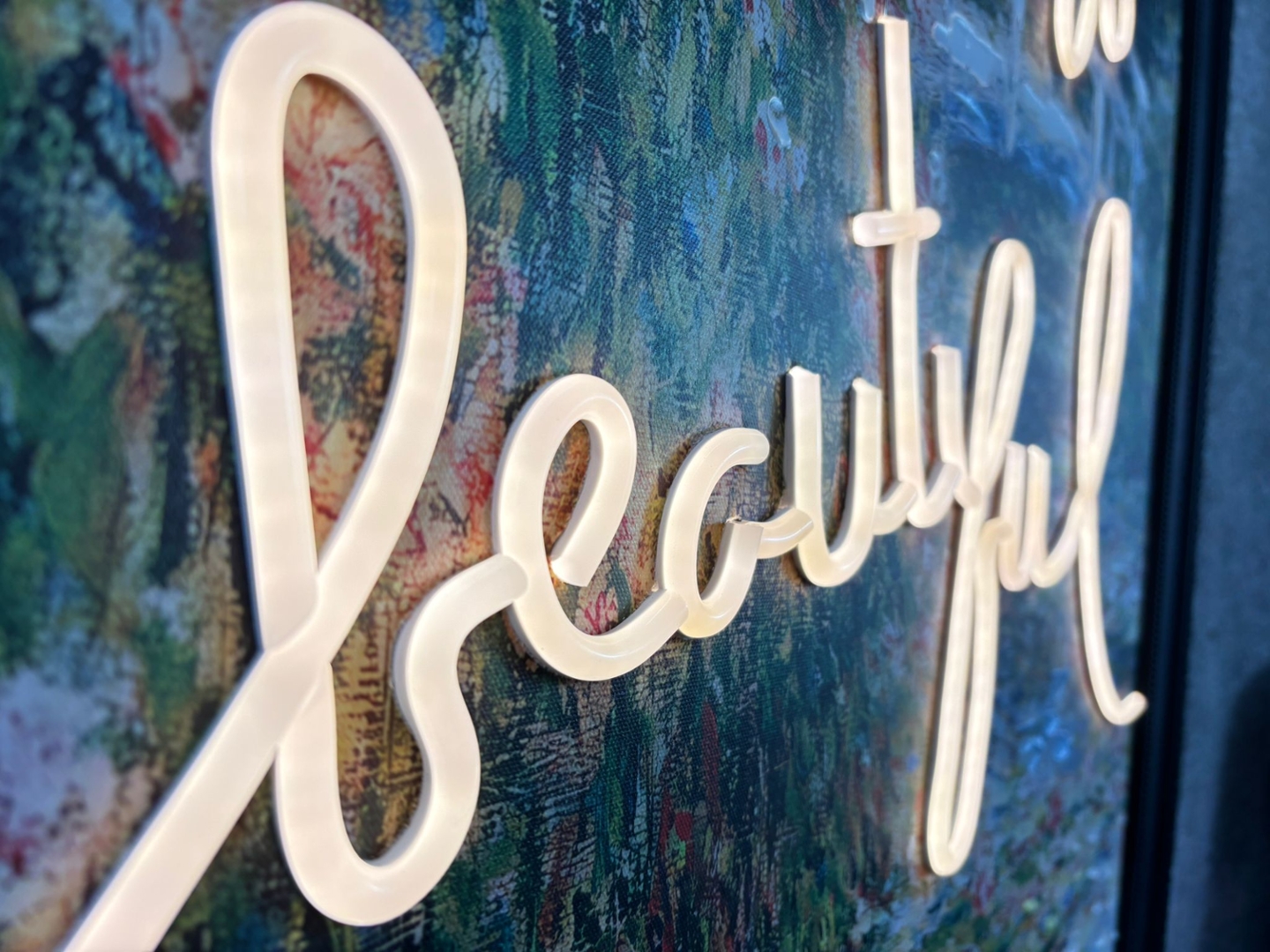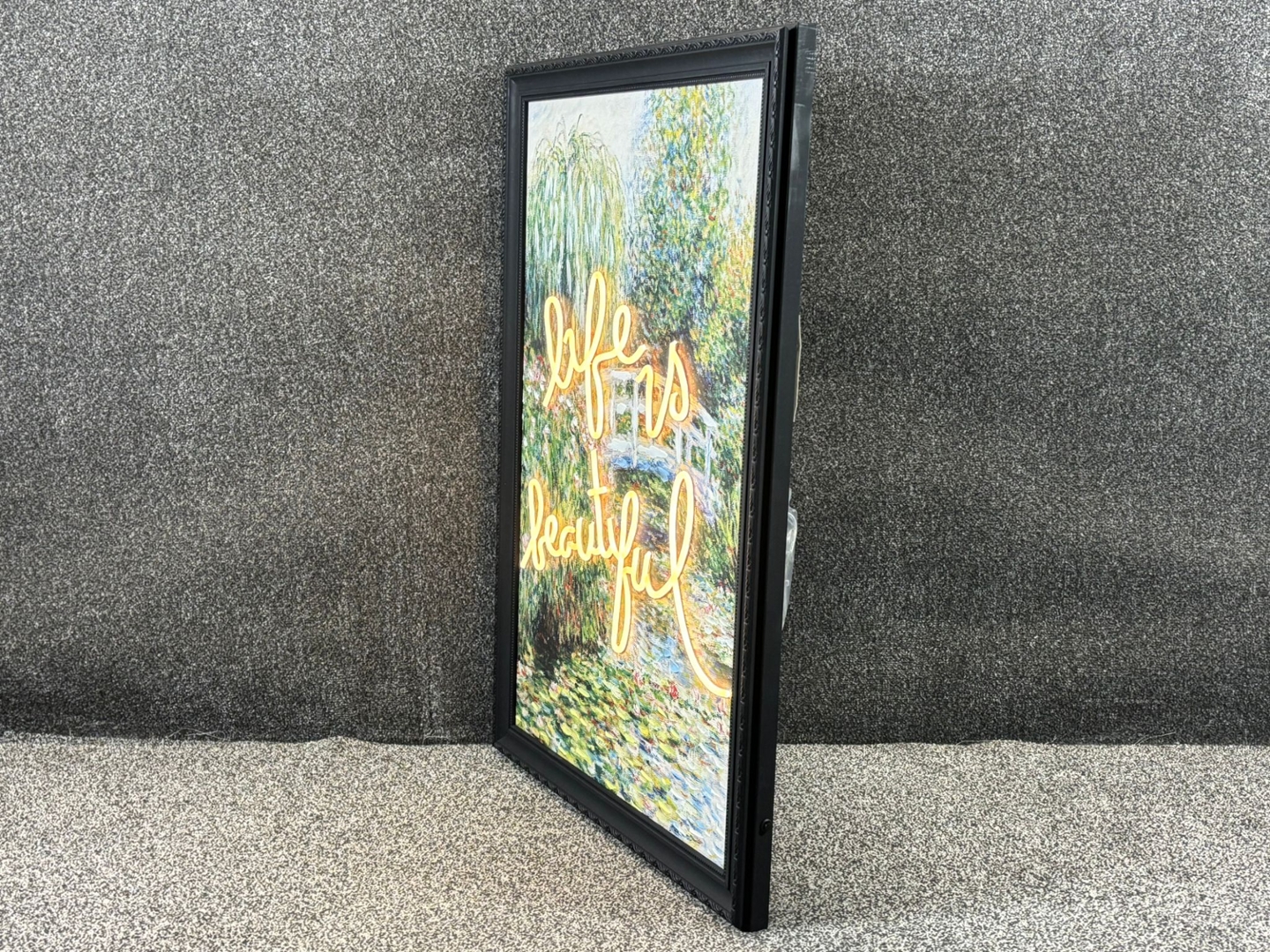 A framed LED wall art combines timeless artistry with modern flair, creating a truly captivating statement piece. Featuring the words "Life is Beautiful" illuminated in warm neon-style LED, the artwork overlays a serene impressionist-inspired garden scene complete with lush greenery, a charming footbridge, and a tranquil lily pond. The combination of soft brushstroke imagery with glowing contemporary lettering produces a contrast that is both uplifting and eye-catching.