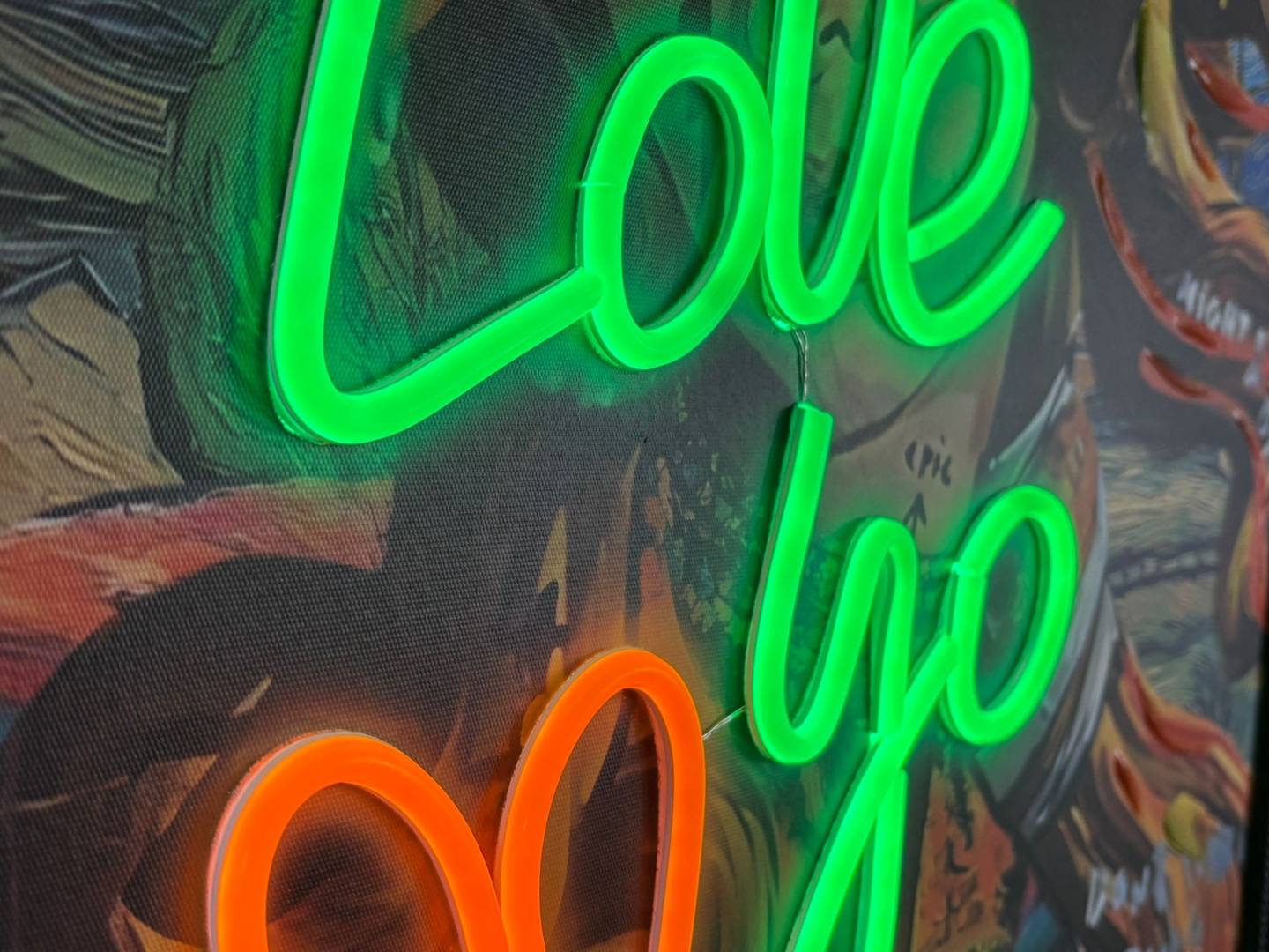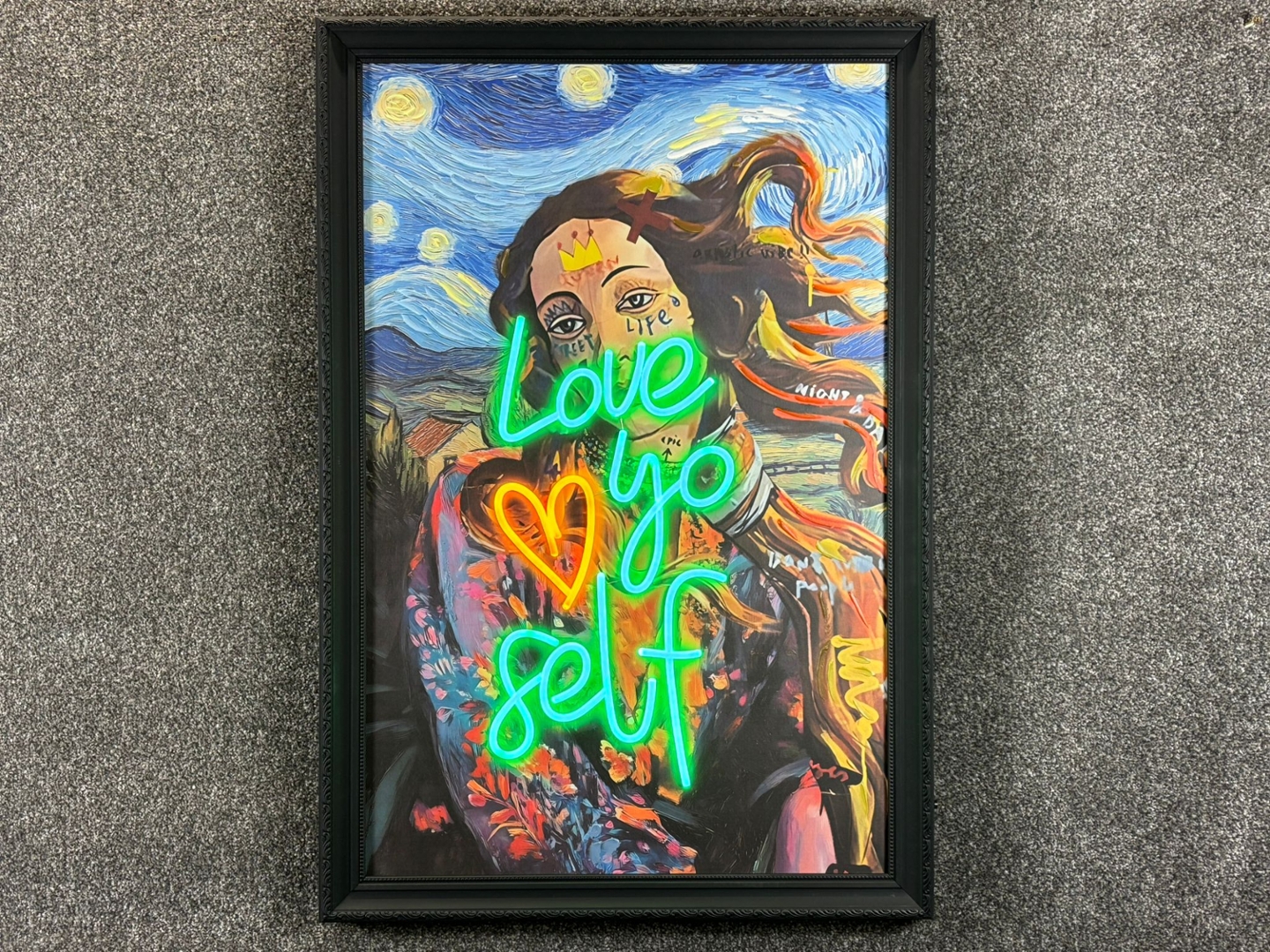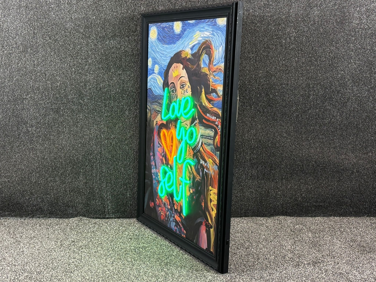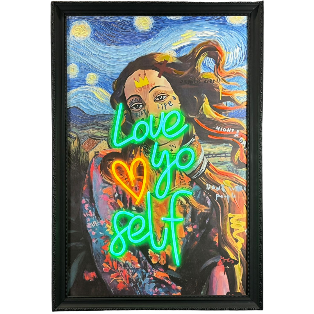 A framed LED wall art piece that radiates empowerment and style, this captivating design features the glowing message “Love Yo Self” in bold neon-style illumination. The words are lit in striking green and orange tones, layered over a vibrant pop-art inspired portrait set against a swirling night sky backdrop reminiscent of Van Gogh’s Starry Night. The fusion of classical artistry with modern street-style expression makes this artwork a standout piece full of personality and meaning.