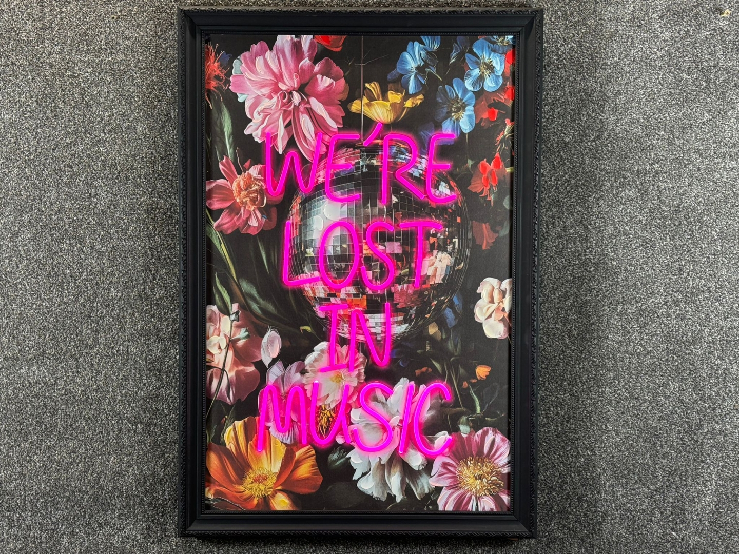 A framed LED wall art piece that celebrates creativity and rhythm, this stunning design features the glowing phrase “We’re Lost In Music” in bold neon pink. The words are set against a dazzling disco ball surrounded by a dramatic arrangement of richly colored flowers, blending the vibrancy of nightlife with the elegance of classic floral art. The result is a striking fusion of modern energy and timeless beauty.